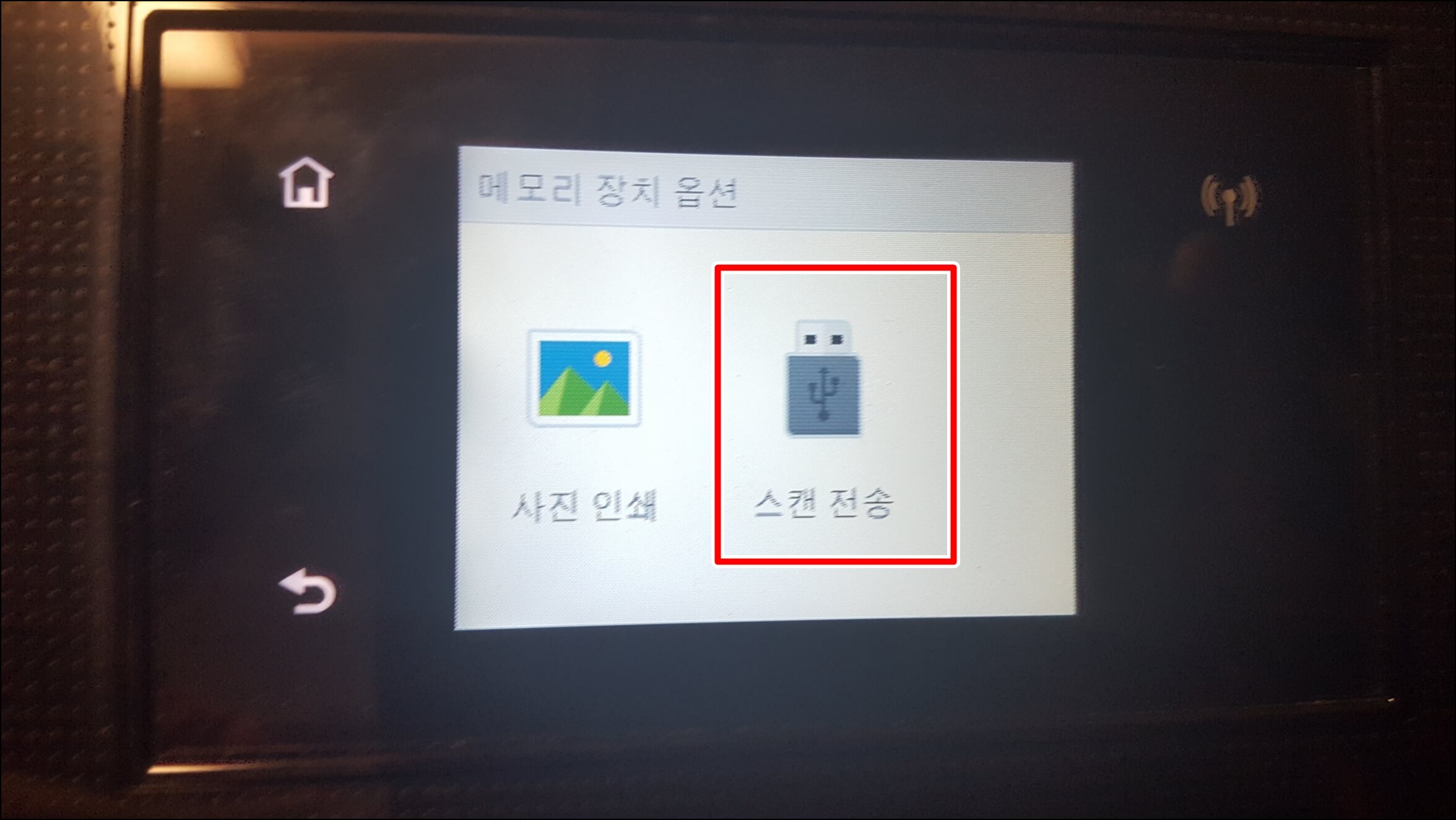 USB를 꽂으면 프린터 기기에서 자동으로 인식하여 사진 안 쇄 와 스캔 전송 2가지 옵션이 나오는데 이 중에서 스캔 전송을 눌러줍니다.