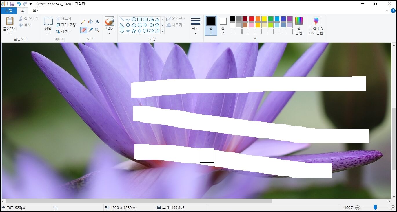 아래가 지우개 사이즈를 최대한으로 늘렸을 때 지워지는 양입니다. 딱 보기에도 너무 답답하게 느껴지는 것 같습니다. 이 상태에서 그림판 지우개를 크게 하는 법은 Ctrl+[-] [+]를 눌러서 조절할 수 있습니다.