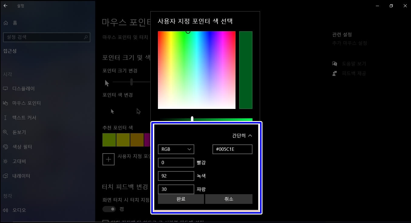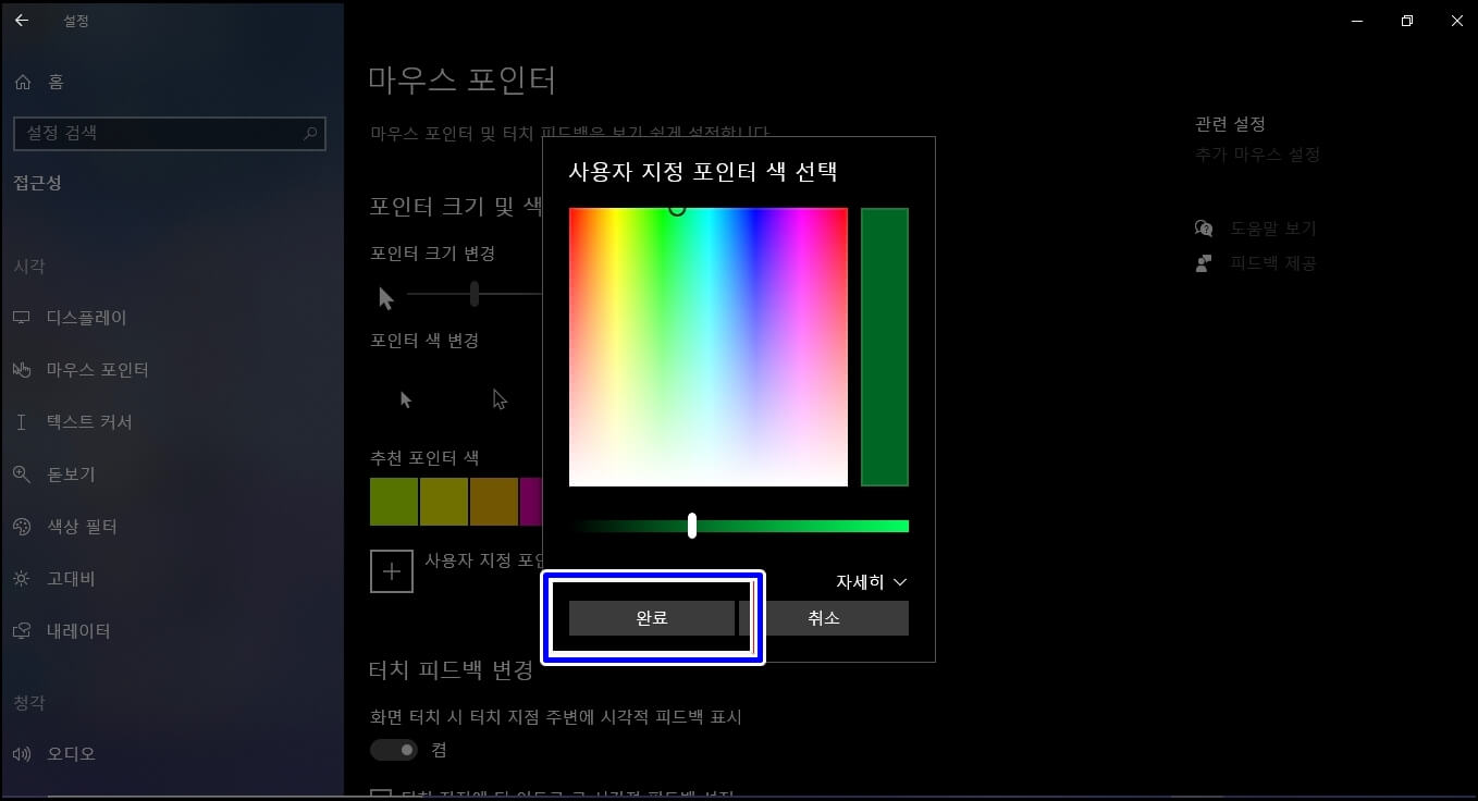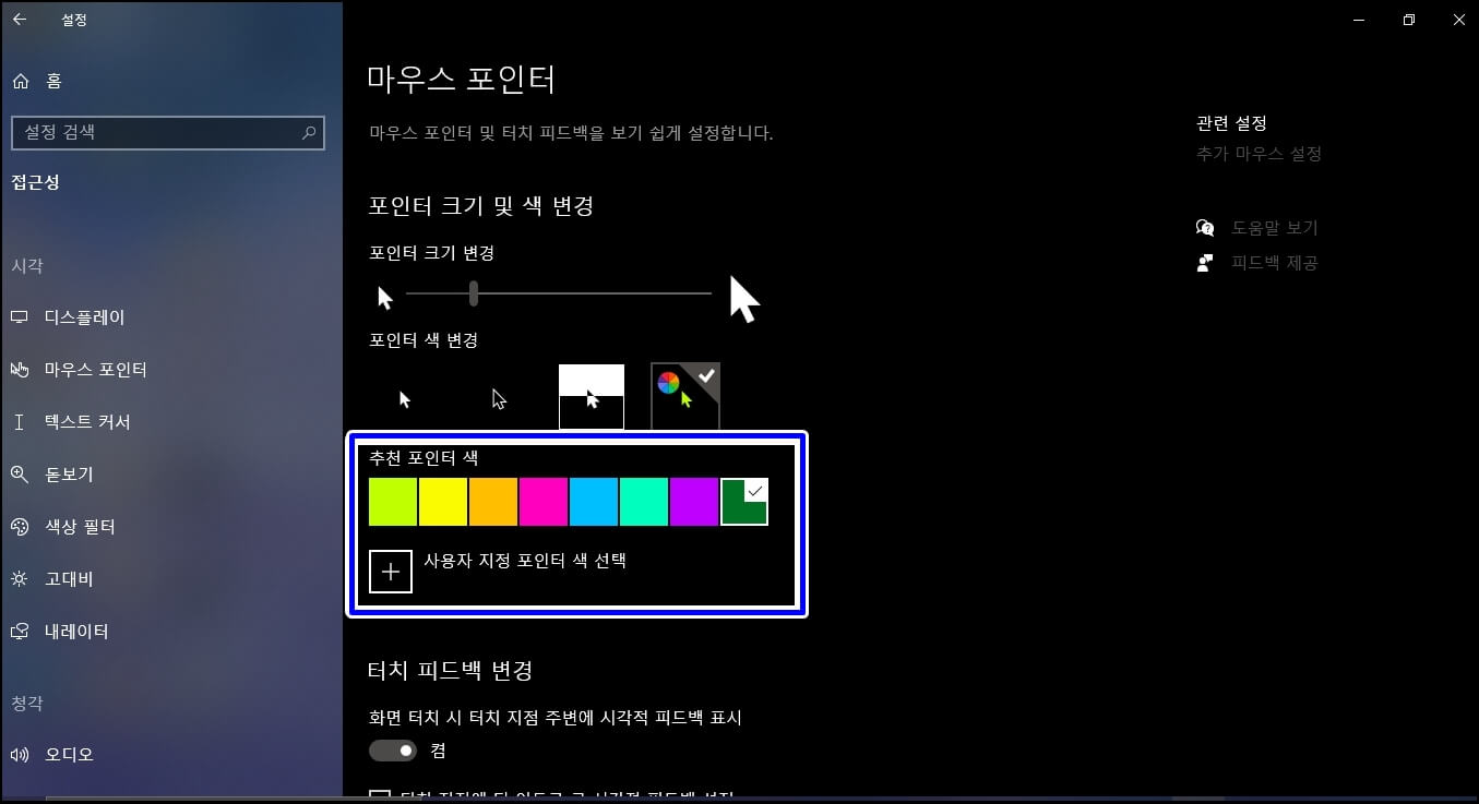 포인터 색 변경은 커서의 색깔을 변경해 주는 기능으로써 흰색, 검은색, 반전됨, 사용자 지정이 있습니다. 자신만의 색깔을 찾고 싶으신 분들은 사용자 지정을 클릭하셔서 색깔을 찾으시면 되겠습니다.