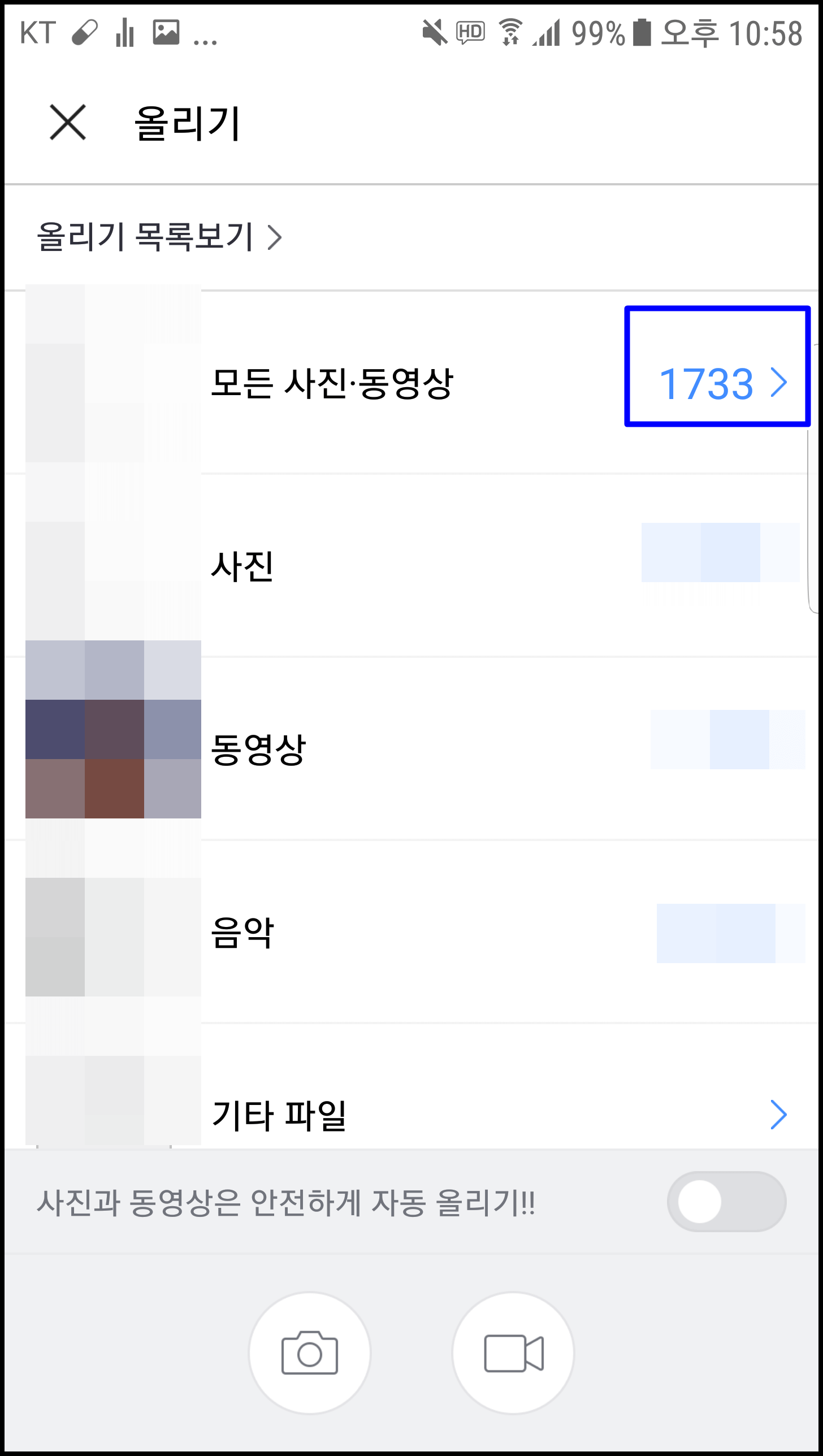 이 버튼을 눌러주시면 스마트폰에 모든 사진과 동영상 파일이 있는 탭이 뜨는데 여기서 올리고자 하는 파일들을 선택하셔서 올려주시면 됩니다.