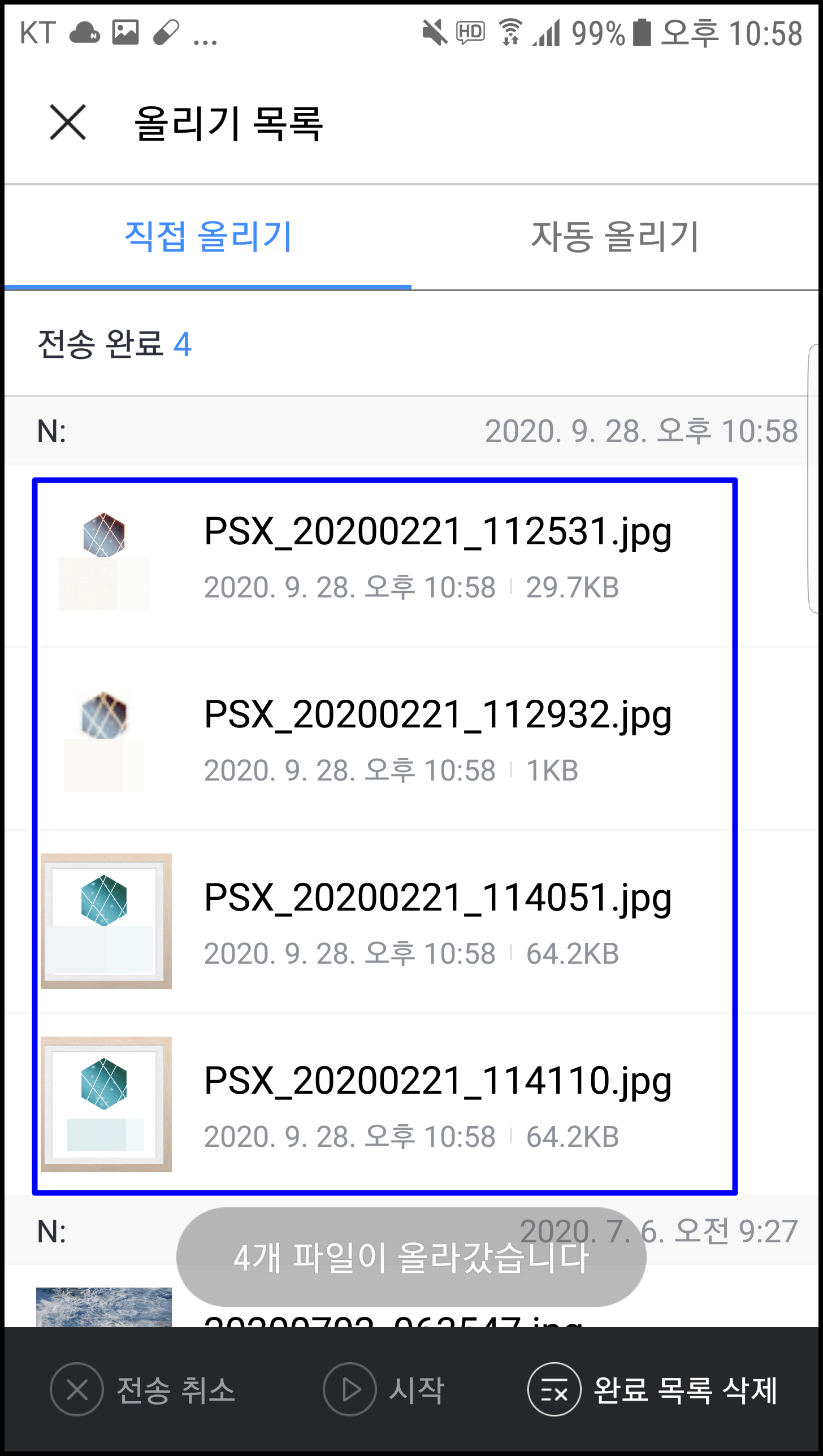 제 스마트폰에 있는 4가지의 이미지를 올려봤습니다. 업로드할 파일들을 체크해 주시고 아래 올리기를 클릭하시면 우측에서 보시는 바와 같이 '4개의 파일이 올라갔습니다.'라는 문구와 함께 파일이 업로드됩니다.