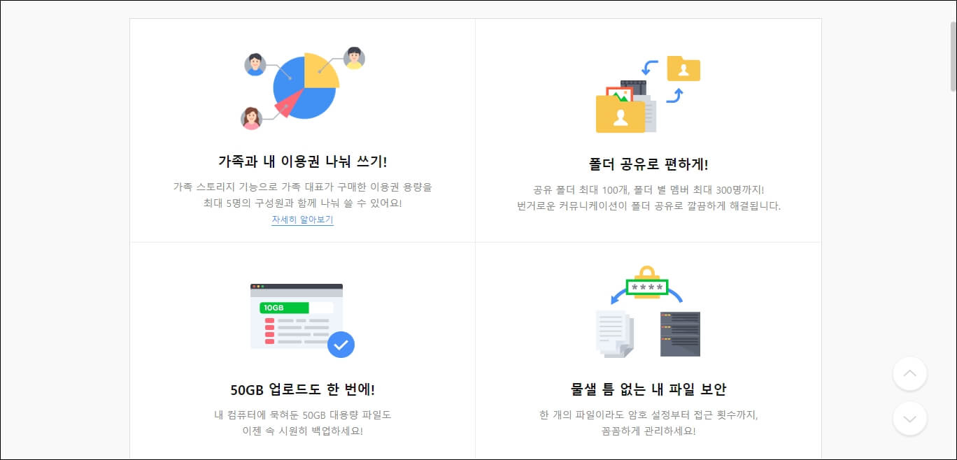 클라우드 서비스는 가족들과 이용권을 나눠 쓸 수도 있고 공유 폴더를 최대 100개까지 생성 가능하며, 폴더 별 멤버는 최대 300명까지 공유가 가능합니다. 그리고 50GB에 달하는 초대용량 파일도 단 한방에 업로드를 할 수 있으며 파일마다 암호 설정까지 할 수 있으니 유료 결제를 하신다면 더욱 편리하고 안전성 있게 사용하실 수 있으실 겁니다. 최근에는 클라우드에서도 해킹 사건이 빈번이 일어나고 있다고 하는데 아무래도 개인 정보가 들어가 있기 때문에 많이 불안하실 수도 있습니다. 무료로 쓰실 분들은 꼭 유료로 전화해서 사용해 주시면 되고요..