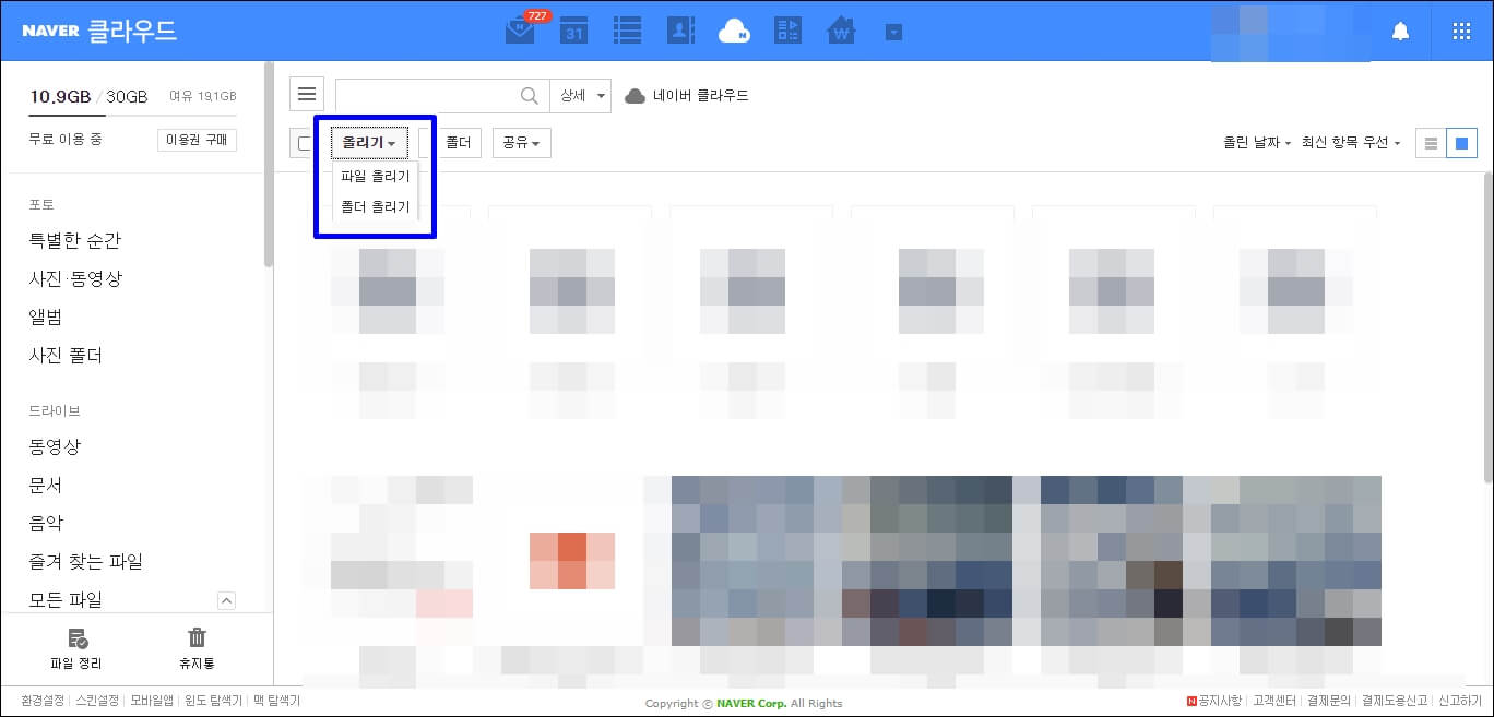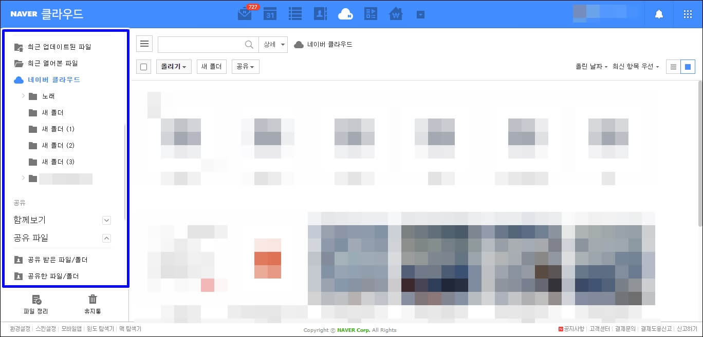 네이버 클라우드 플랫폼의 사용방법은 매우 간단한데 파일 올리기와 폴더 올리기만 기억하시면 됩니다. 컴퓨터에 있는 파일로 인해 용량이 과부하가 걸린다면 하나의 폴더를 만들어서 [폴더 올리기]를 통하여 업로드만 해주시면 됩니다. 저도 10GB 이상을 전부 업로드해서 꽤 많은 용량을 절약하고 있습니다. 그리고 올리기 옆에 [새 폴더]를 클릭하시면 말 그대로 새로 저장할 수 있는 새 폴더가 만들어집니다. 폴더 이름을 변경하시고 거기에 파일을 넣으시면 됩니다.