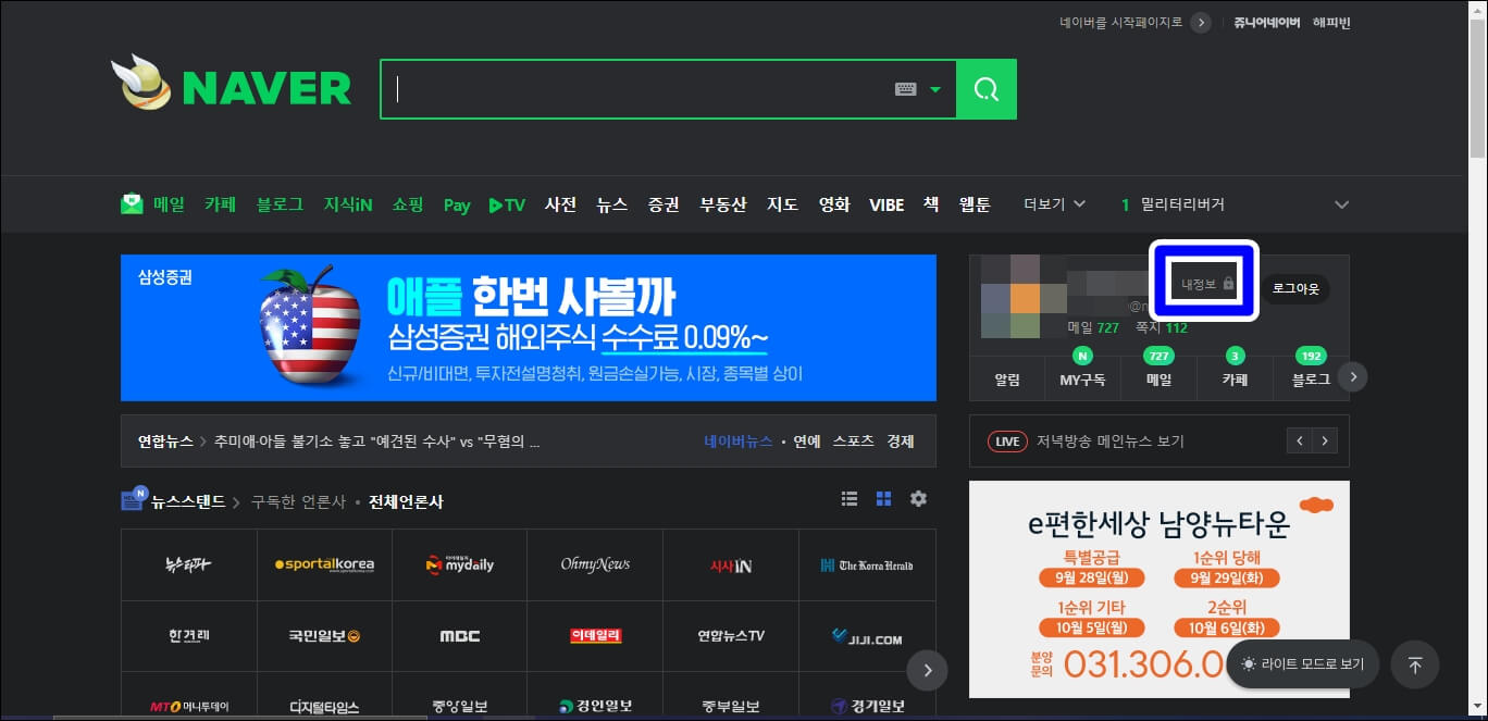 무료로 사용하실 분들은 계정에 대한 보안 설정을 따로 해두셔야 합니다 네이버에 들어가셔서 내 정보를 클릭합니다.