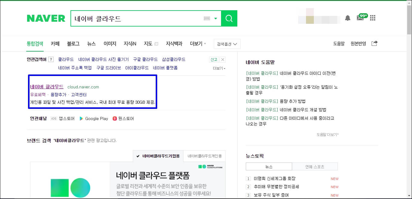 네이버에서 클라우드를 검색하시고 cloud.naver.com으로 접속합니다.