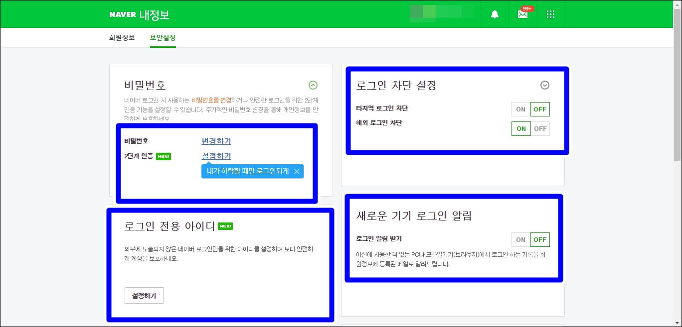 보안설정 탭을 클릭하시면 여러 가지 보안 설정이 나오는데 해외 로그인 차단은 필수고 가장 중요한 보안이 바로 2단계 인증입니다. 내가 아닌 누군가가 로그인을 시도한다면