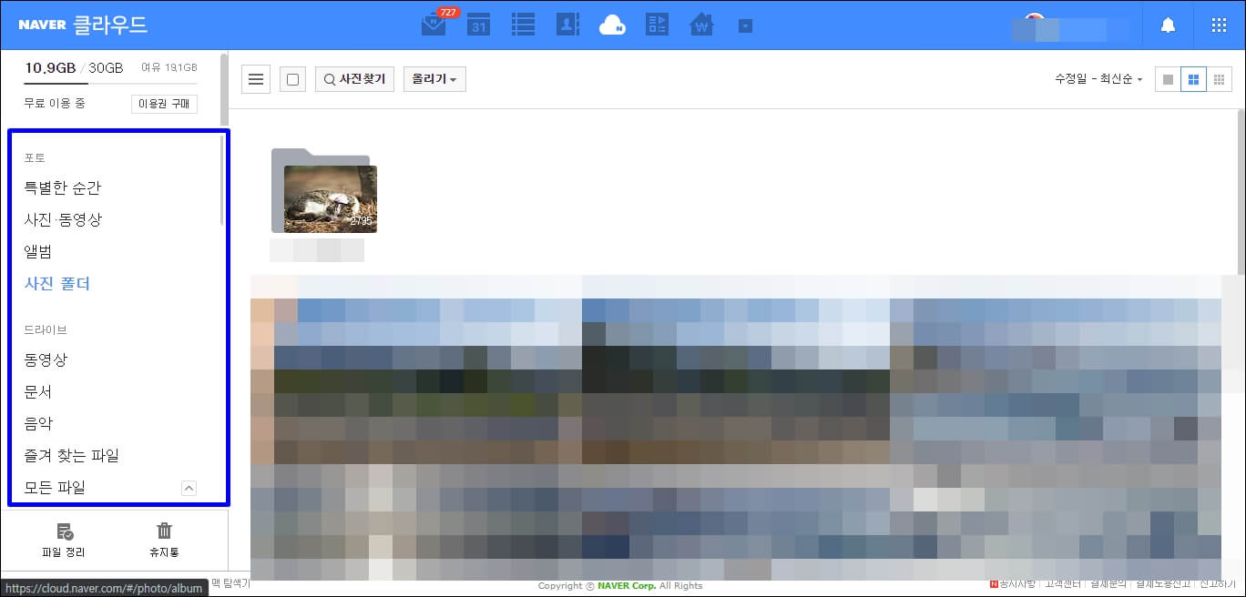 그리고 우측에 보시면 특별한 순간, 사진/동영상, 앨범, 사진 폴더가 있고 드라이브 영역에는 동영상, 문서, 음악 등의 폴더가 존재합니다. MP3 파일이 많으신 분들은 음악 탭을 클릭하여 업로드해주시면 되고 만화 동영상이 많으신 분들은 동영상 탭을 선택하여 영화나 동영상 파일을 업로드해 주시면 됩니다.