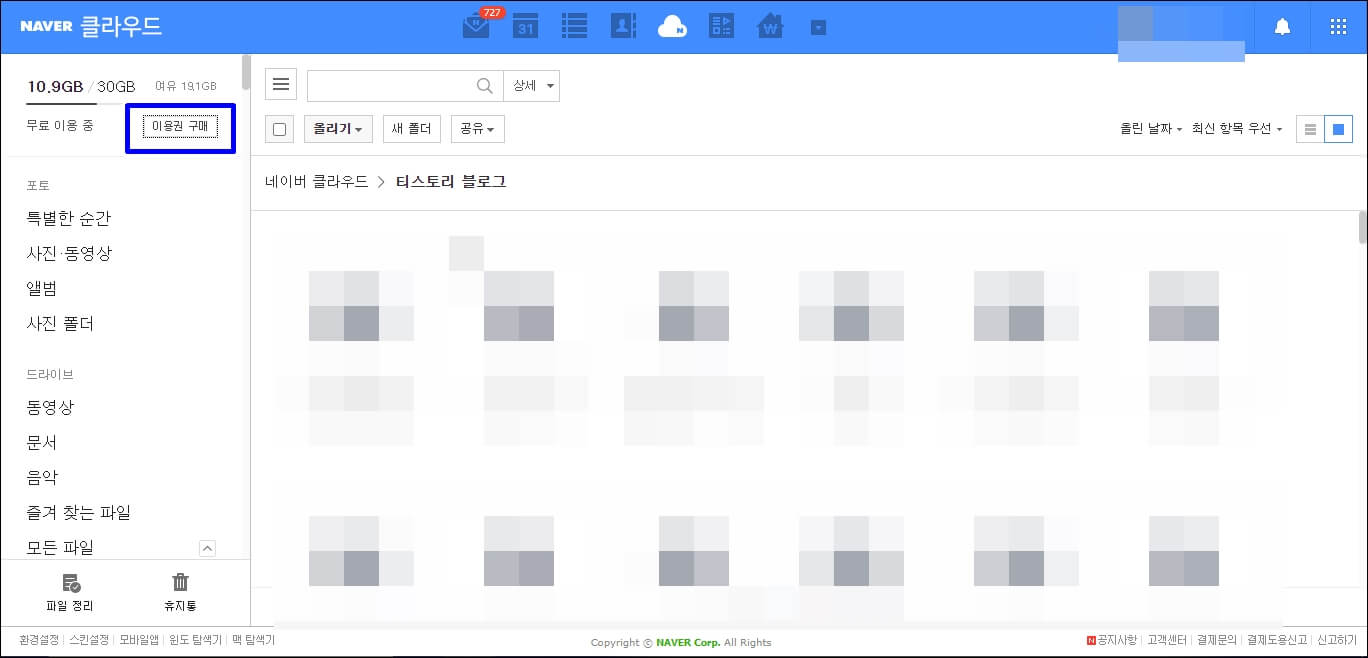 30GB 안쪽으로 사용을 하신다면 무료로 계속 사용하셔도 되겠지만 그 이상의 용량을 사용하고 싶으시다면 좌측 상단에 [이용권 구매]를 클릭하셔서 이용권을 구매하시면 됩니다. 특히 포맷을 해야 하는데 만화, 영화 파일 등 주로 동영상 파일이 많으신 분들은 저렴한 가격에 이용권을 구입하셔서 사용하시면 됩니다.