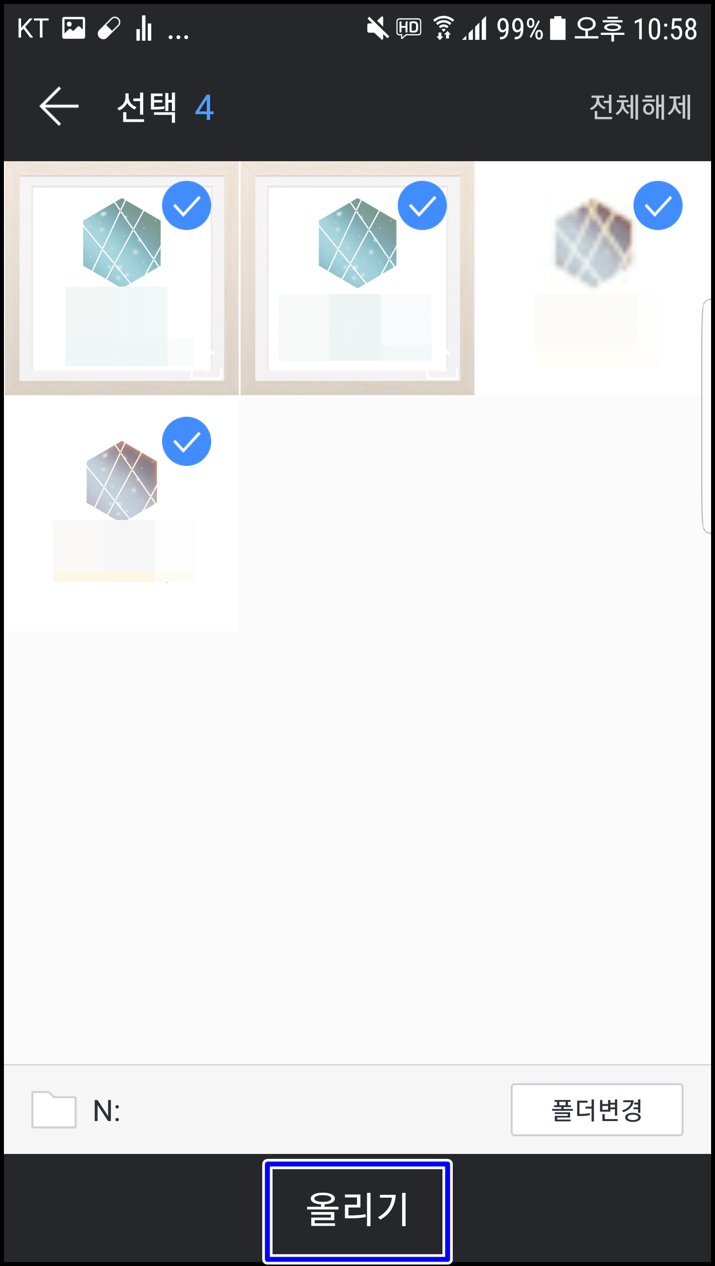 제 스마트폰에 있는 4가지의 이미지를 올려봤습니다. 업로드할 파일들을 체크해 주시고 아래 올리기를 클릭하시면 우측에서 보시는 바와 같이 '4개의 파일이 올라갔습니다.'라는 문구와 함께 파일이 업로드됩니다.