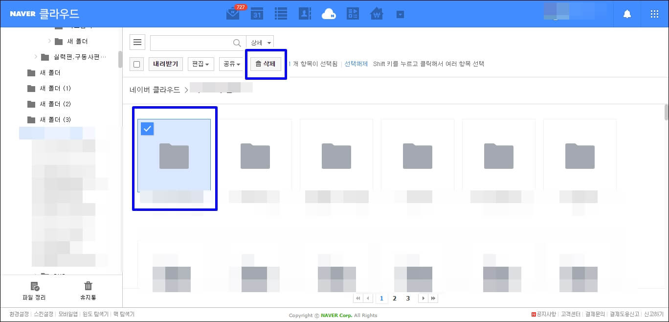 삭제하는 방법도 매우 간단한데요.. 삭제할 파일이나 폴더를 클릭하시고 삭제를 누르시면 끝납니다. 그리고 휴지통에 접속하셔서 비워주시면 됩니다.