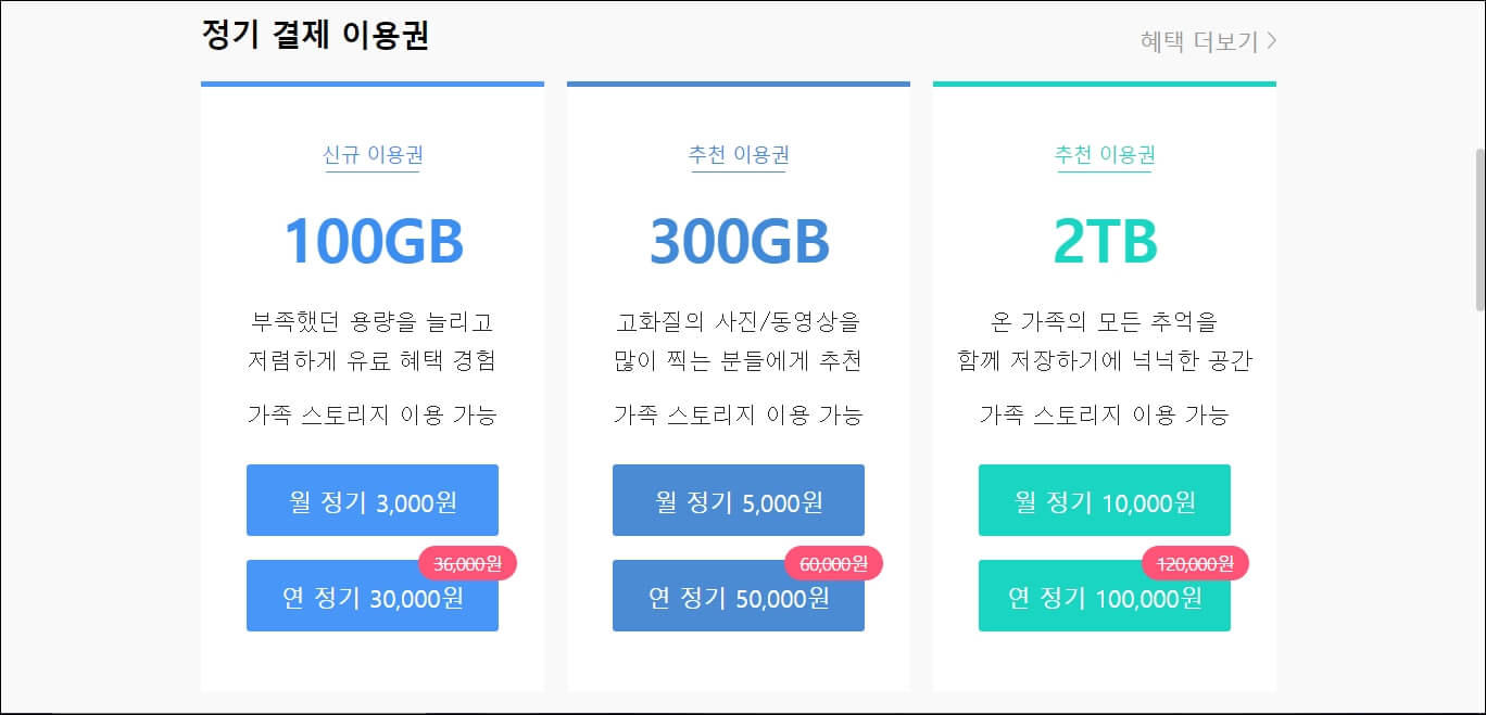 2TB 한 달에 10,000원 1년에 100,000원 수준입니다. 부가세는 별도로 내야 된다는 점 참고하시길 바랍니다. 특히 300GB짜리는 원래 200GB였는데 최근에 100GB를 추가로 더 늘려주었습니다. 하지만 진짜 어지간히 동영상 파일이 많다고 해도 기업이 아닌 이상은 100GB만으로도 충분하지 않을까 싶네요.
