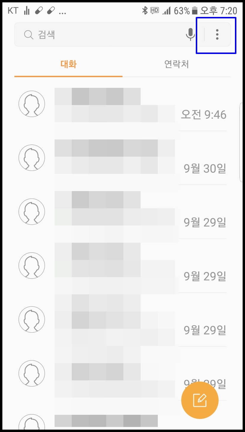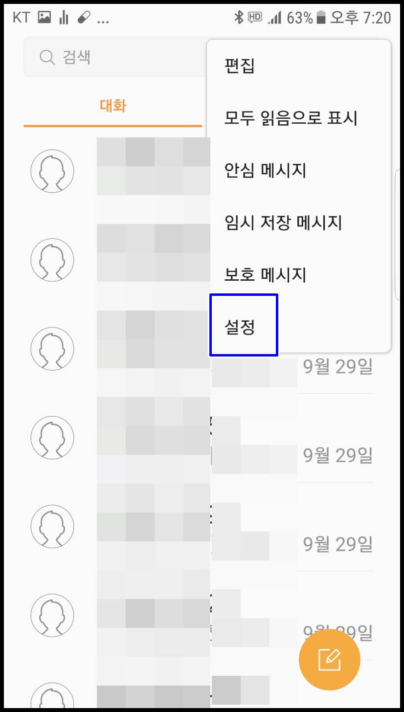 안전 안내 문자 차단은 굉장히 간단합니다. 먼저 메시지 탭에 접속하여 우측 상단에 메뉴판을 눌러주신 다음 설정으로 접속해 줍니다.