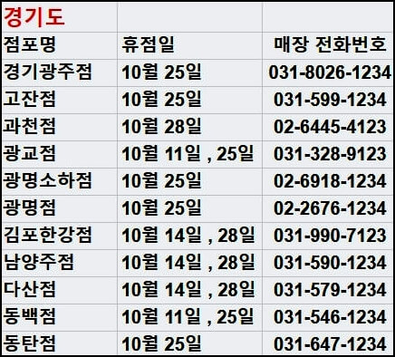 고잔점 과천점 광교점 광명소하점 광명점 김포한강점 남양주점 다산점 동백점 동탄점 별내점 보라점 부천점 분당점 산본점 서수원점 성남점 수원점 수지점 시화점 안성점 안양점 양주점 여주점 오산점 용인점 의왕점 의정부점 이천점 일산점 죽전점 중동점 진접점 킨텍스점 파주 운정점 파주점 평촌점 평택점 포천점 풍산점 하남점 화성 봉담점 화정점 흥덕점