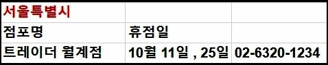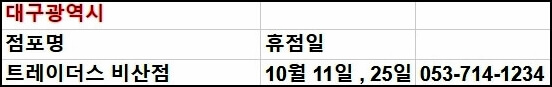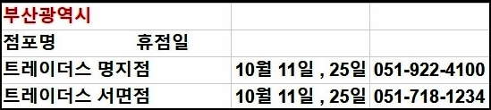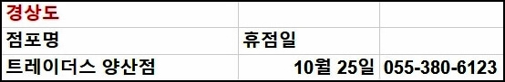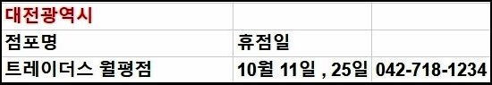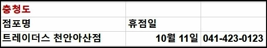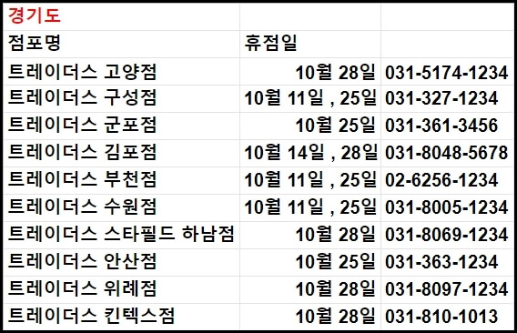 전국에 있는 트레이더스는 총 19개의 지점이 있습니다. 모든 영업 지점의 영업시간은 오전 10시~오후 23시로 동일하기 때문에 영업이 끝나기 1시간 전에 미리 가셔서 필요한 물건을 구매하시는 것이 좋습니다. 이어서 각 지점별 휴무일을 안내해 드립니다.