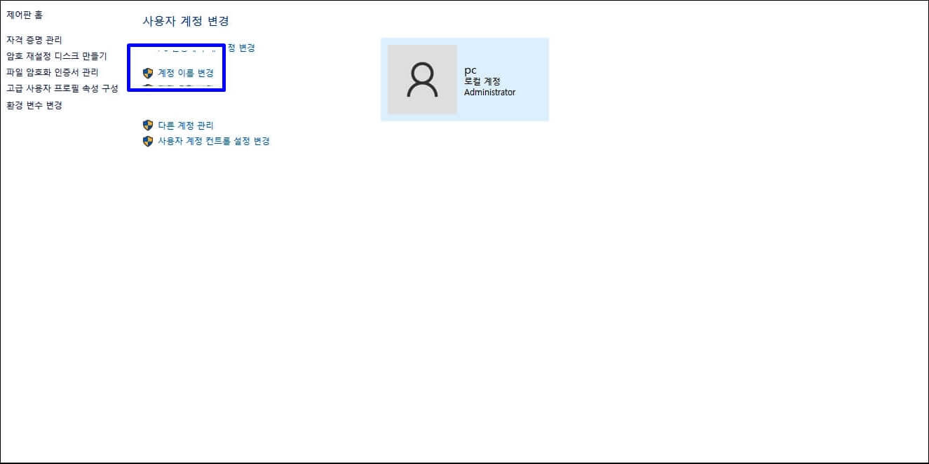 보통 이름은 PC라는 이름이 기본으로 제공됩니다. 계정 이름 변경을 클릭합니다.