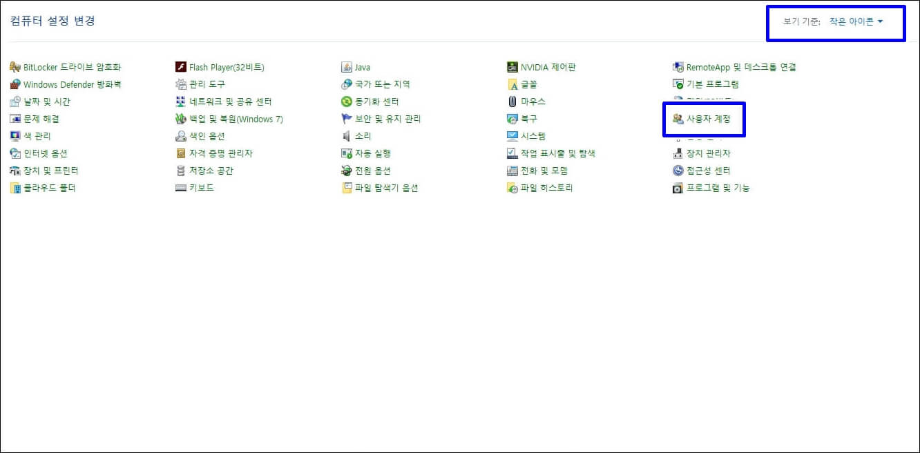 보기 기준을 작은 아이콘 범주로 변경하시고 사용자 계정을 클릭합니다.