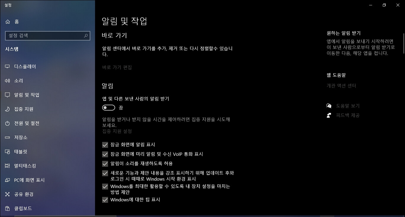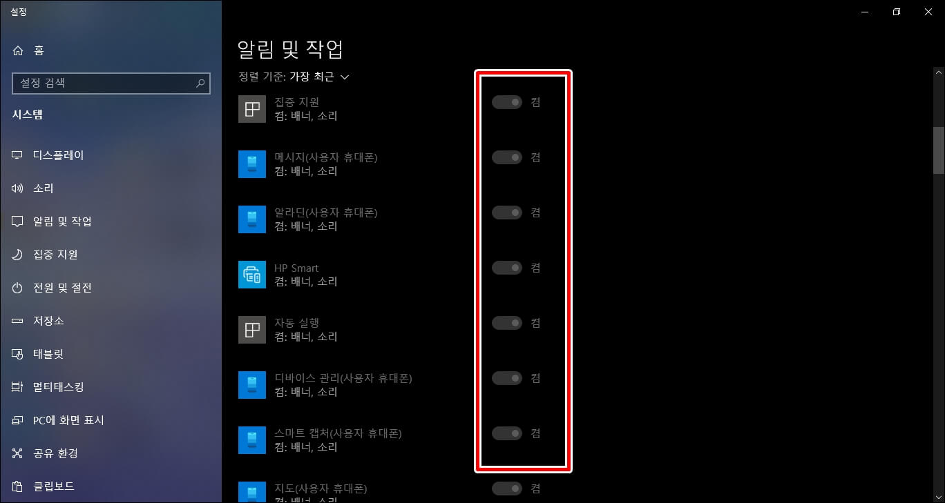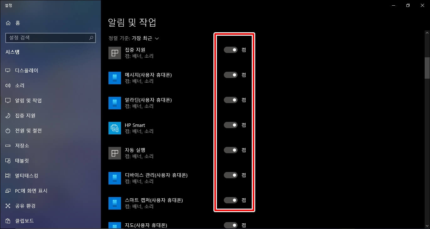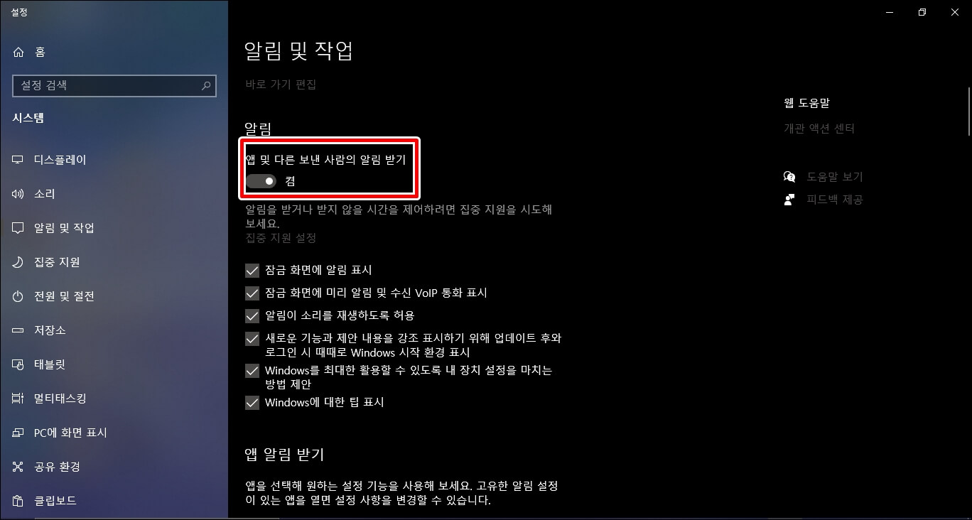 그러면 알림 및 작업 탭이 뜨게 되고 여기서 [앱 및 다른 보낸 사람의 알림 받기]를 왼쪽으로 밀어주시면 꺼지게 됩니다.