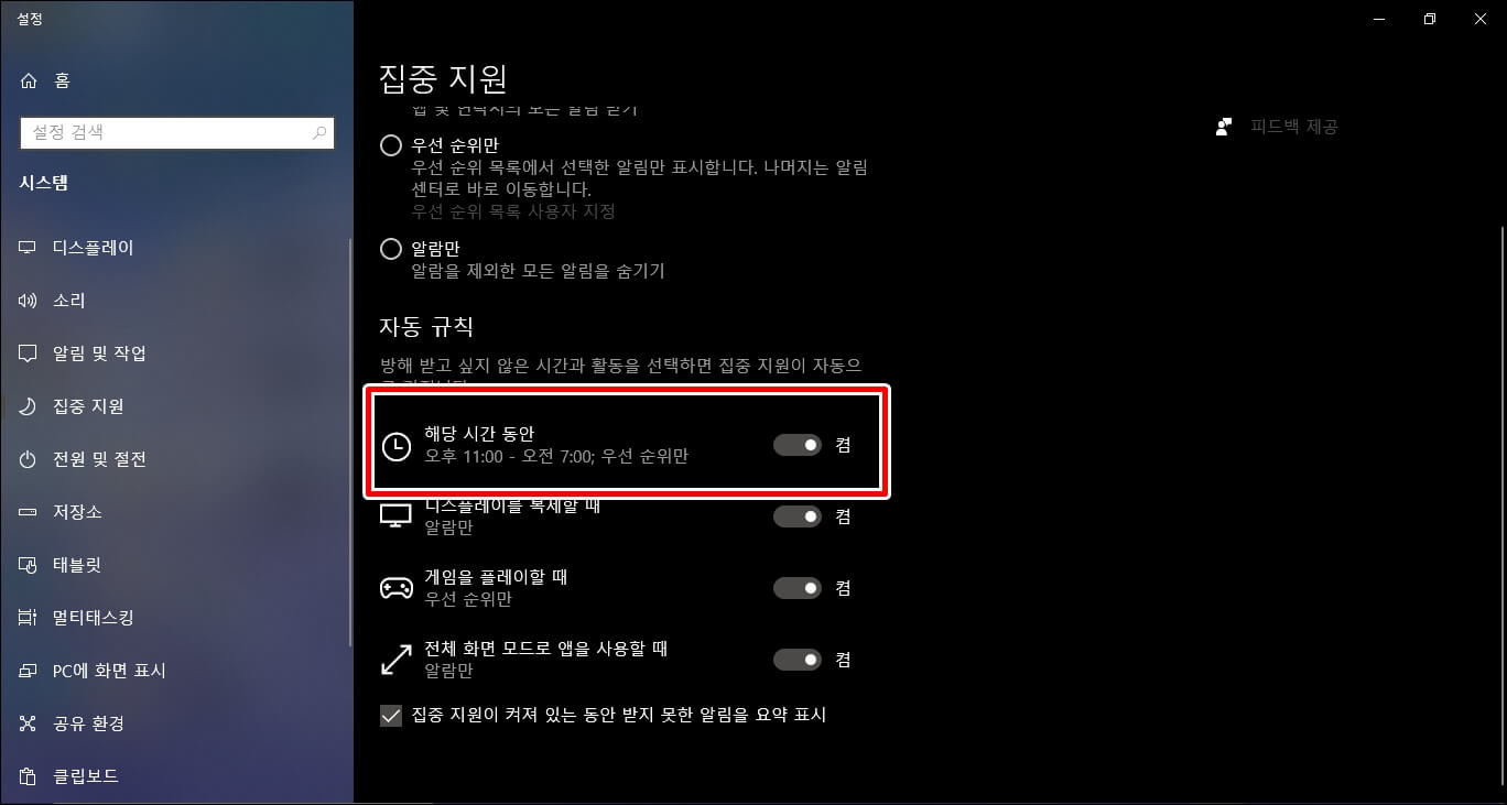 그리고 자신이 집중할 시간을 설정하면 그 시간 동안에는 어떠한 알림 메시지와 알림 창이 뜨질 않습니다. 이처럼 Windows10을 폭넓게 사용하려면 잘 사용하지 않는 기능들을 검색하여 찾아보는 것이 중요합니다. 단순히 웹 서핑만 하는 것이 아니라 다양한 기능들을 찾아본다면 자기 취향에 맞춰서 컴퓨터를 사용할 수 있을 것입니다.