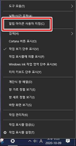 우클릭하여 알림 아이콘 사용자 지정을 클릭합니다.