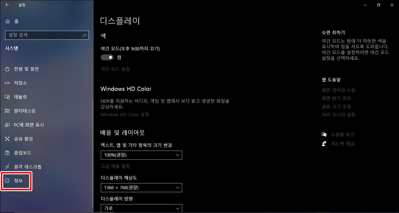 좌측 탭에서 아래로 내려보시면 밑에 정보라는 탭이 있습니다. 정보를 눌러봅니다.