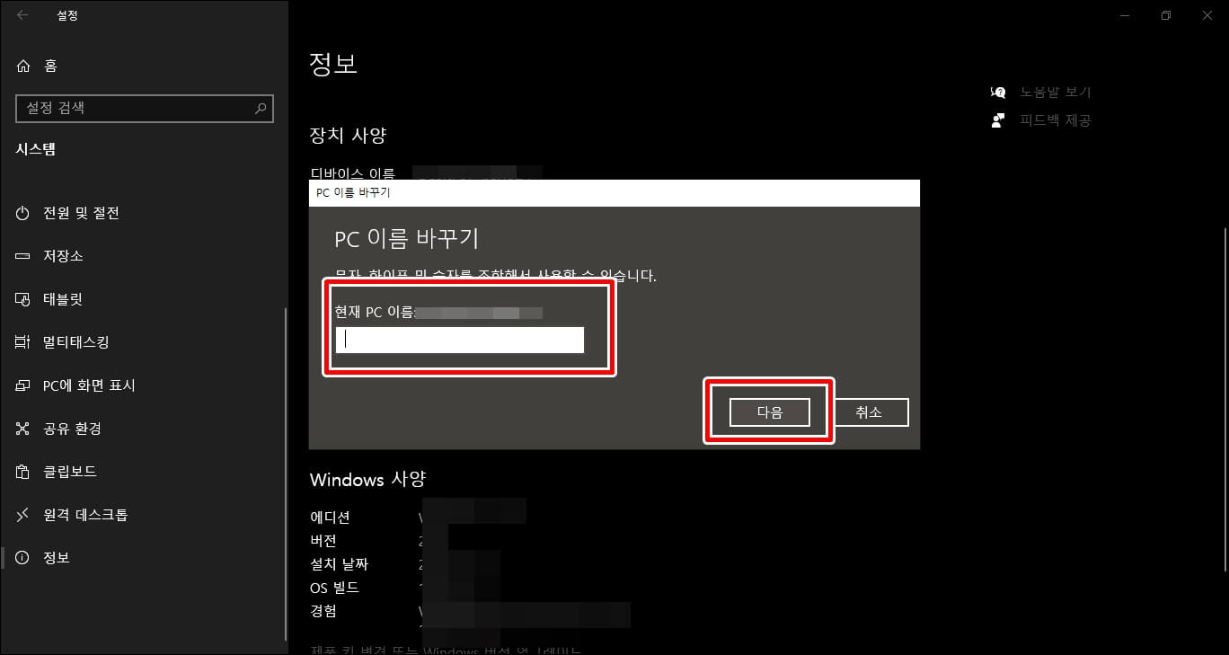 그럼 현재 PC 이름이 있고 변경할 이름을 입력할 수 있는 칸이 생깁니다. 이 칸에다가 자신만의 이름을 넣고 다음을 클릭합니다.