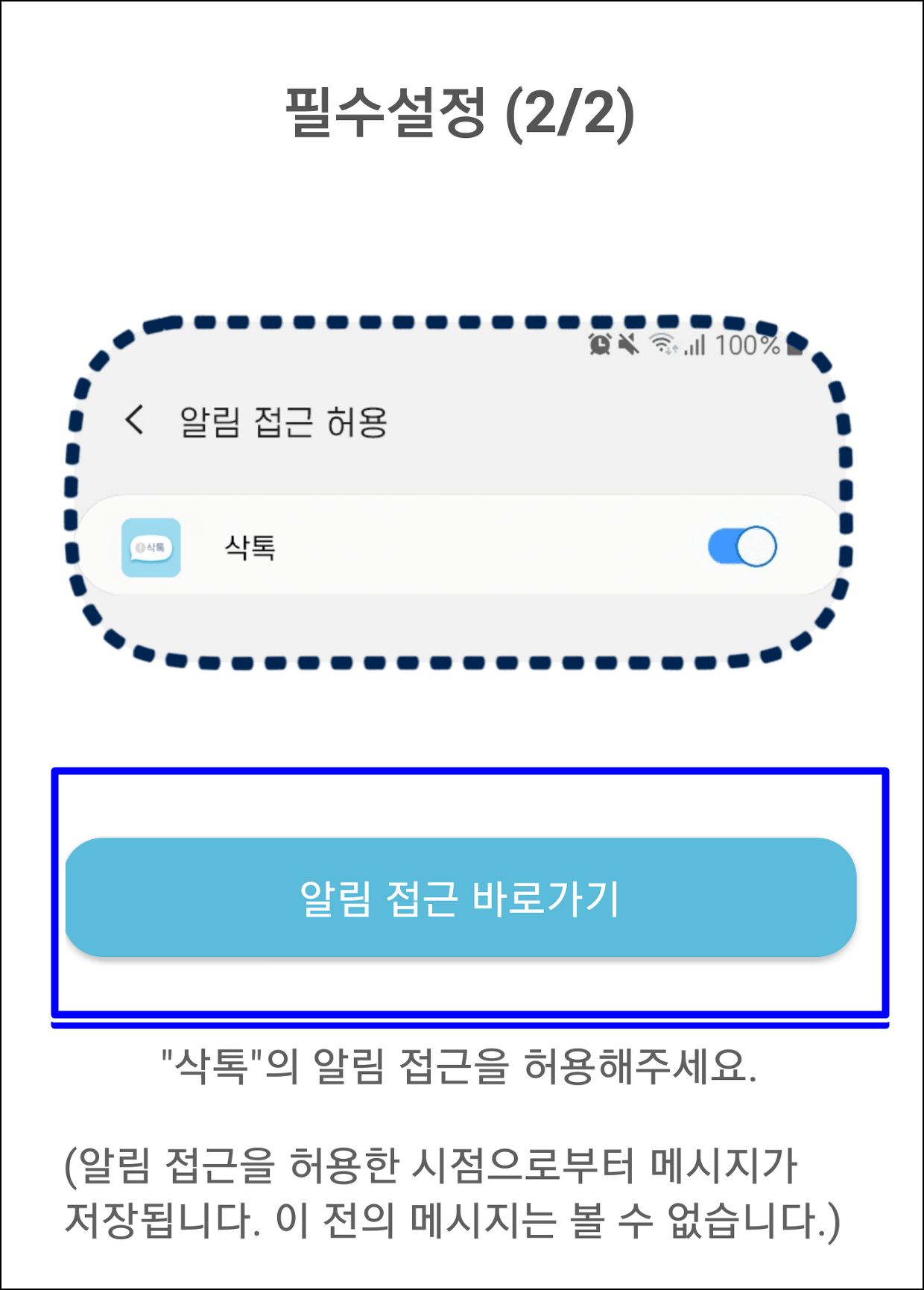 그리고 삭톡에 접속하셔서 필수 설정 (2/2)에 보시면 알림 접근 허용을 해줘야 한다는 안내문이 나오는데요... 알림 접근 바로가기를 눌러봅니다.