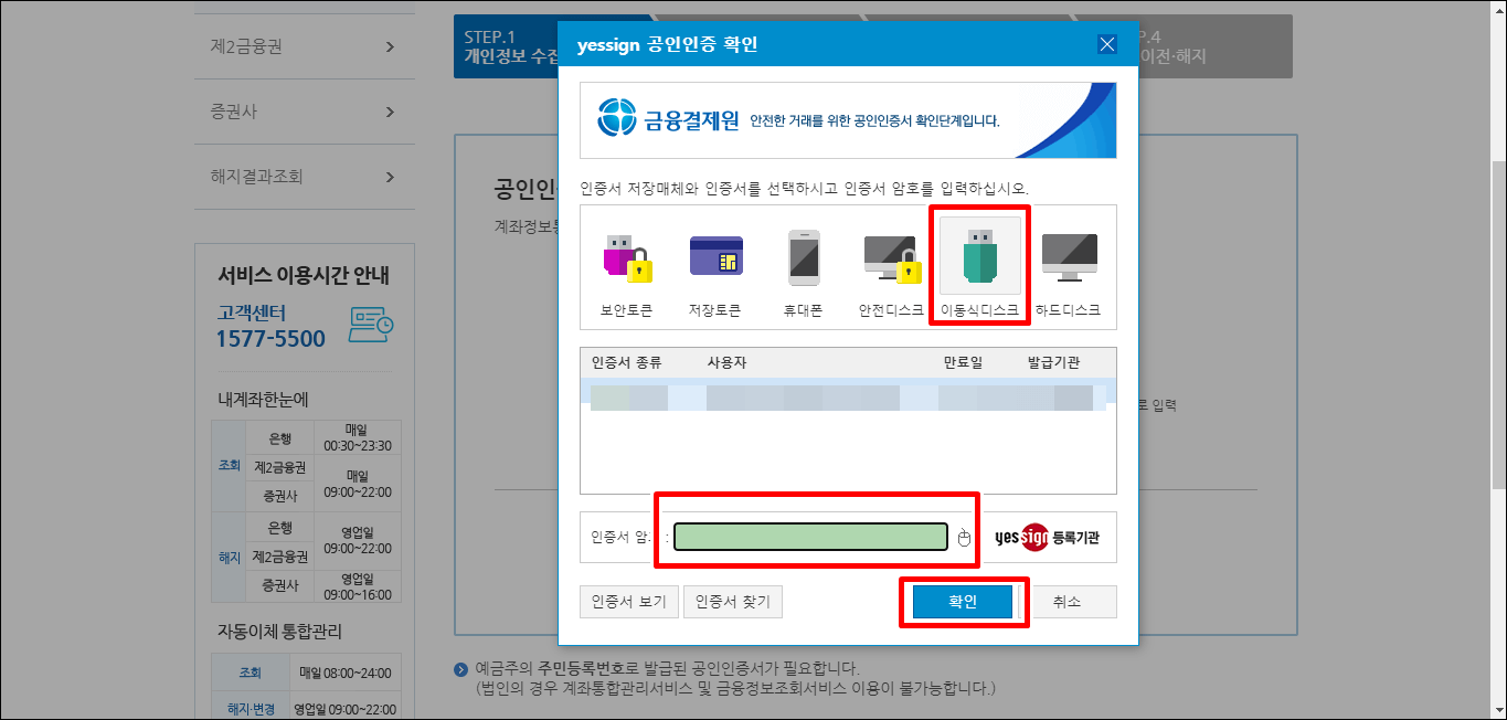 이동식 디스크에 있는 공인인증서를 선택해 주시고 비밀번호를 입력합니다.