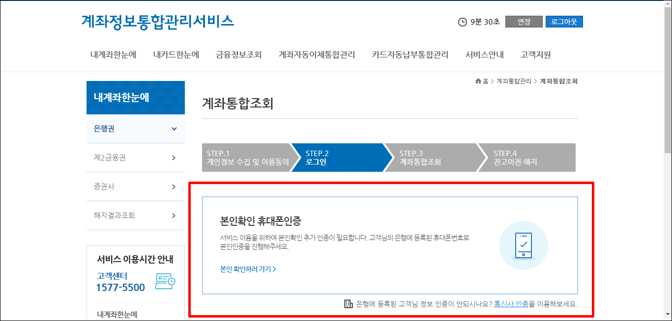 먼저 검색엔진에서 어카운트 인포 또는 계좌정보 통합이라고 검색을 하시면 계좌정보 통합관리 서비스라는 사이트가 나옵니다. 여기에 접속을 하시면 내 계좌 한눈에, 내 카드 한눈에, 금융정보조회, 계좌 자동이체 통합관리, 카드 자동납부 통합관리, 서비스 안내, 고객지원 등의 안내 탭이 나오는데 오늘 우리는 계좌 조회만 해볼 것이기 때문에 내 계좌 한눈에만 클릭해서 통장을 조회를 진행해 보도록 하겠습니다.