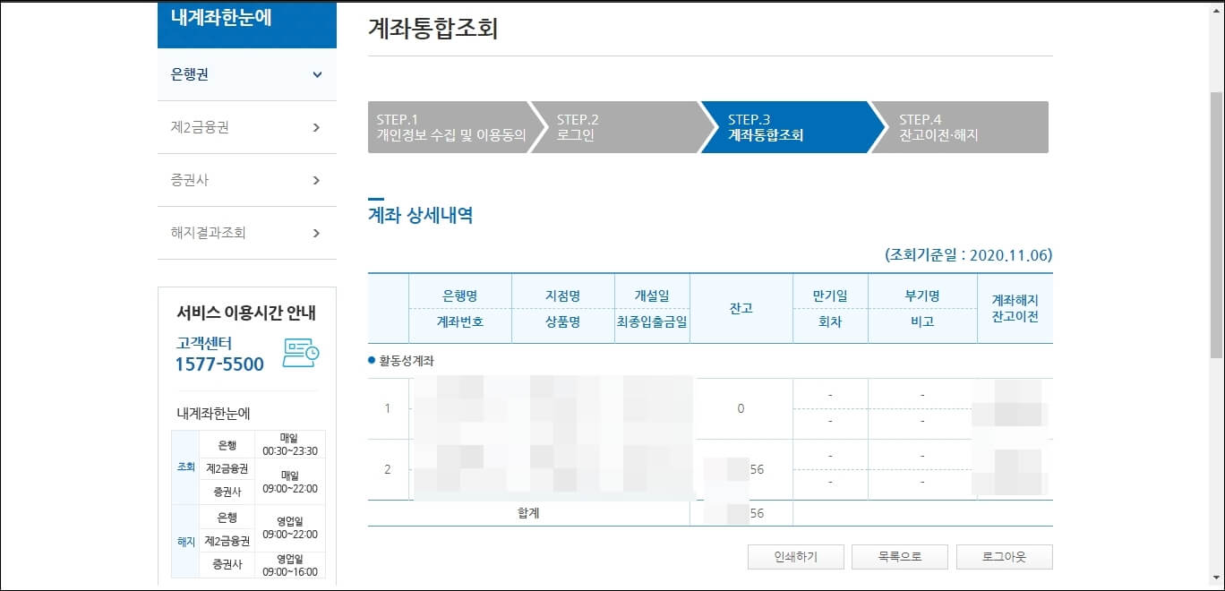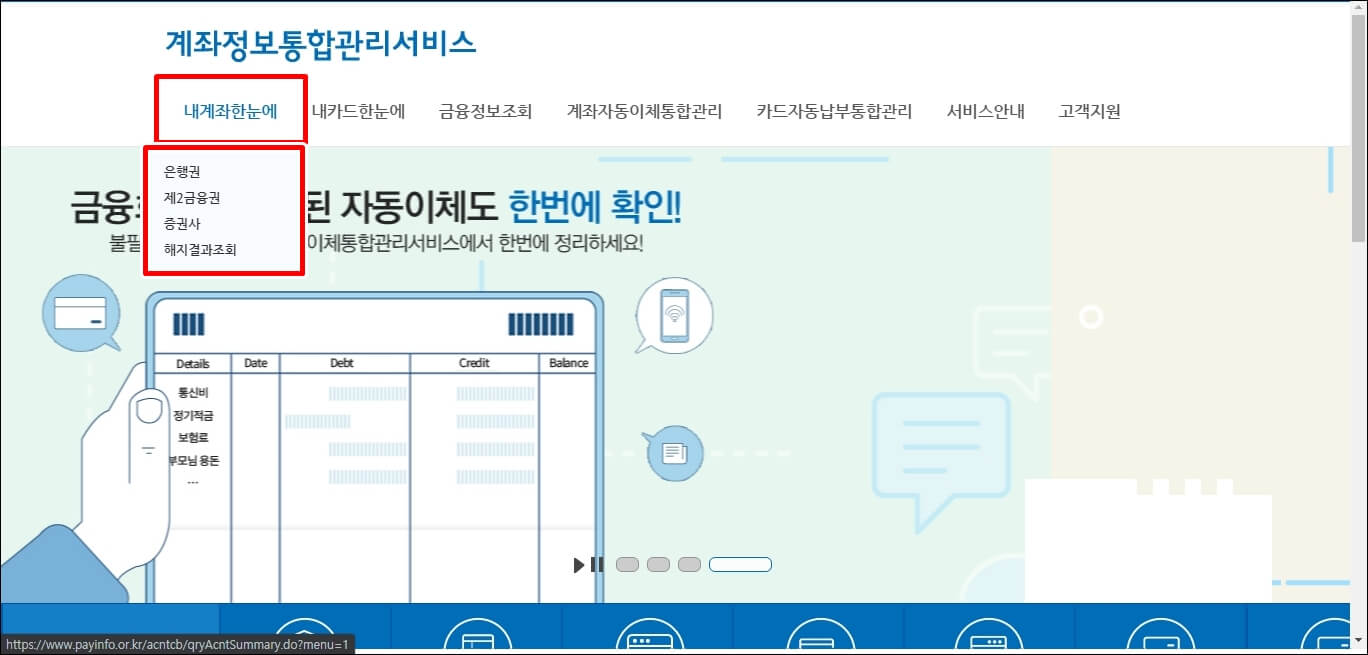 먼저 검색엔진에서 어카운트 인포 또는 계좌정보 통합이라고 검색을 하시면 계좌정보 통합관리 서비스라는 사이트가 나옵니다. 여기에 접속을 하시면 내 계좌 한눈에, 내 카드 한눈에, 금융정보조회, 계좌 자동이체 통합관리, 카드 자동납부 통합관리, 서비스 안내, 고객지원 등의 안내 탭이 나오는데 오늘 우리는 계좌 조회만 해볼 것이기 때문에 내 계좌 한눈에만 클릭해서 통장을 조회를 진행해 보도록 하겠습니다.