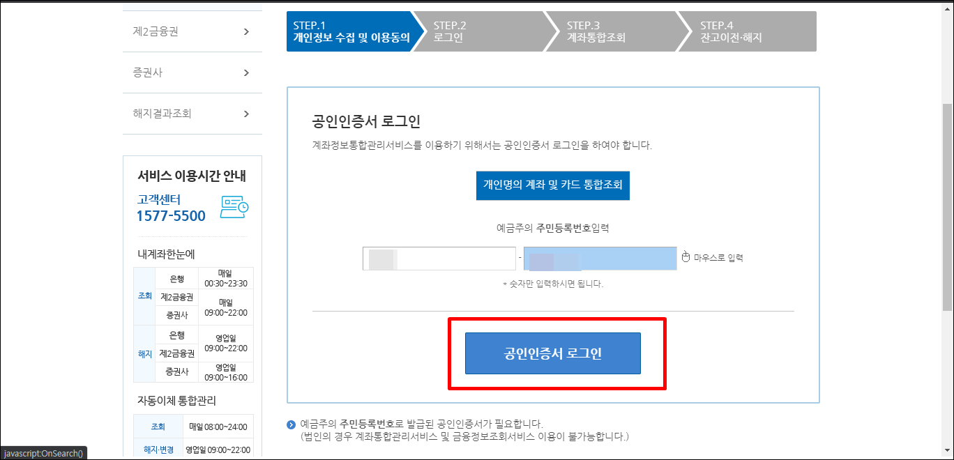 주민등록번호를 입력해 주시고 공인인증서 로그인을 시도합니다.