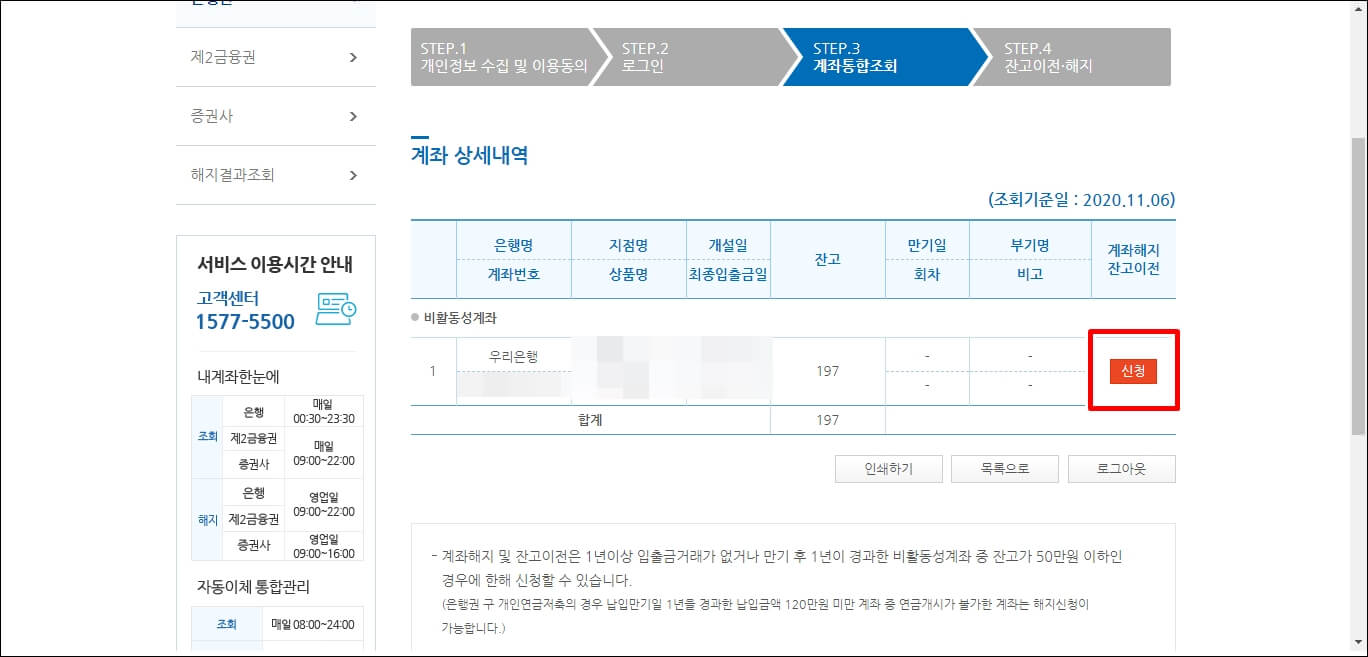 여기서 장기간 사용하지 않거나 필요 없는 통장은 비활동성 계좌로 분류가 되는데요... 사용하지 않는 은행에 들어가셔서 아래와 같이 해지 신청을 하시면 됩니다. 해지 결과는 좌측 중간에 [해지 결과 조회]를 클릭하시면 참고하실 수 있습니다.