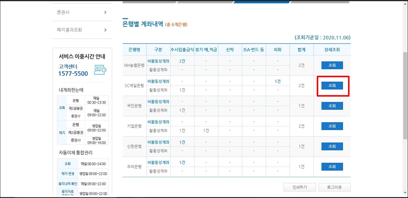 모든 개인정보 확인 절차가 끝나게 되면 아래와 같이 그동안 사회생활을 하면서 가입했던 모든 은행들의 통장이 조회가 됩니다. 1 금융권에서는 NH농협, SC제일은행, 국민은행, 기업은행, 신한은행, 우리은행 등에서 통장을 만들었네요. SC제일은행을 조회해서 잔고를 확인해 보도록 하겠습니다.