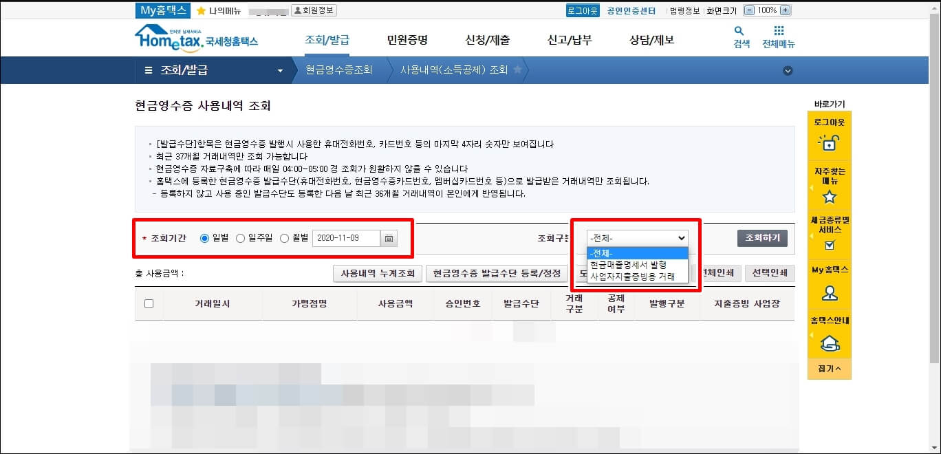 현금영수증은 일별, 일주일, 월별로 조회가 가능하며 사용내역 누계 조회를 조회하실 수도 있고 현금매출명세서 발행, 사업자 지출증빙용 거래를 구분하여 발급받으실 수 있습니다. 사용내역은 엑셀로 내려받을 수 있고 전체 인쇄, 선택 인쇄를 선택하여 자신이 원하는 부분만 출력하실 수 있습니다.
