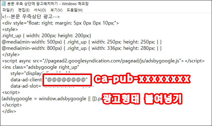그럼 바로 실습을 해보도록 하겠습니다. 실습에 앞서서 텍스트 파일 하나를 업로드해드릴 건데 여기서 자기의 광고 펍 번호를 적용해서 준비하셔야 합니다. 아래 텍스트 파일을 다운로드해서 파일을 열어봅니다.