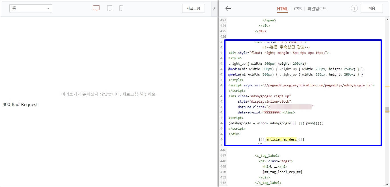 article_rep_desc를 검색하셨다면 article_rep_desc 바로 위에 입력하신 텍스트 파일을 붙여 넣기 하시고 적용을 눌러주시면 됩니다. 적용하기를 누르셨다고 모든 과정이 끝난 건 아닙니다. 먼저 PC로 포스팅에 적용됐는지 확인해 보시고 스마트폰으로 자신의 포스팅에 접속하여 우측에 광고가 뜨고 글이 옆에서 있는지 잘 보셔야 합니다. 이 텍스트를 플러그인에 붙여 넣기 하니깐 모바일에서는 적용되지 않았습니다.