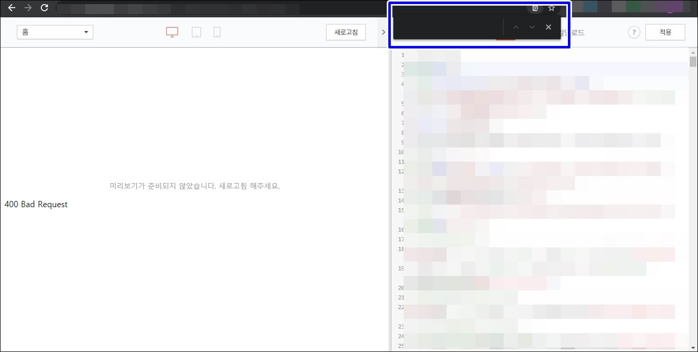 그리고 Ctrl+F를 누르셔서 검색을 해줘야 하는데 만일 처음 하시는 분들이라면 아래와 같은 실수를 자주 하실 겁니다. Ctrl+F를 윈도 창에서 누르게 되면 아래와 같이 검은색 검색창이 뜨게 되는데요.. 이거는 티스토리 HTML과 상관없는 검색창이라 여기서는 검색이 되지 않습니다.