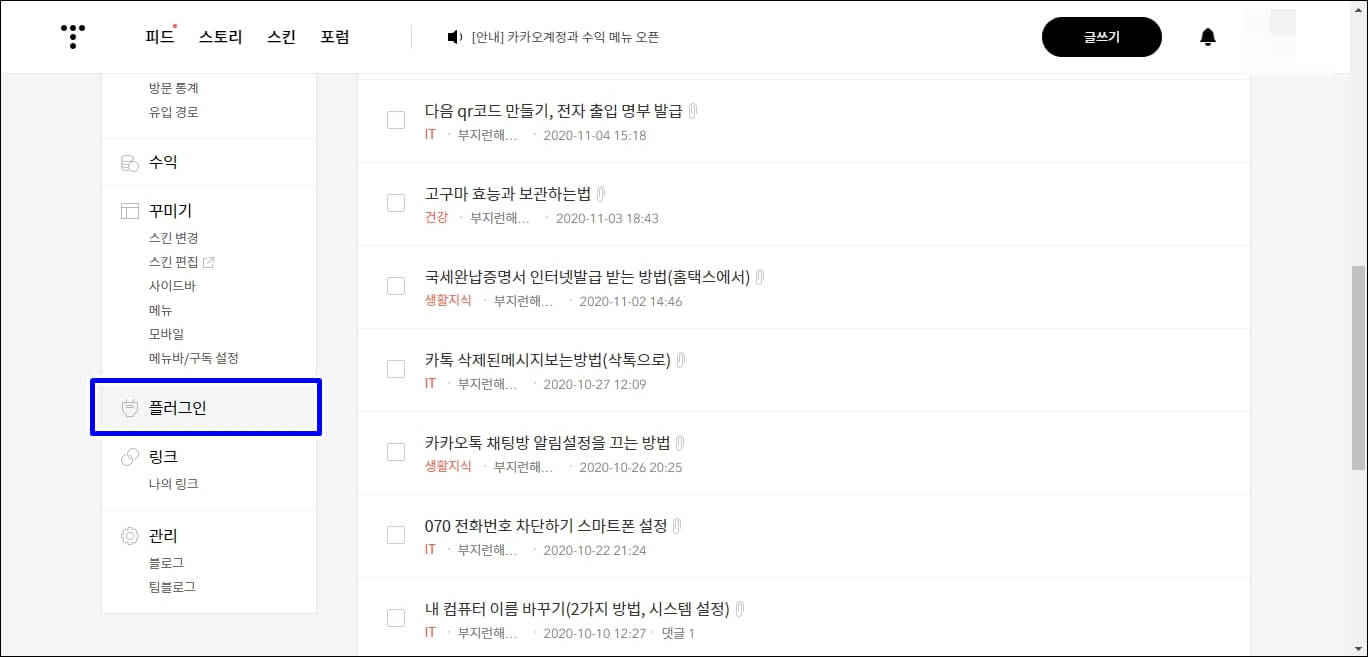 다음으로는 플러그인 세팅을 먼저 해줘야 하는데요. 관리 탭에 접속하셔서 좌측 중간에 플러그인을 클릭합니다.