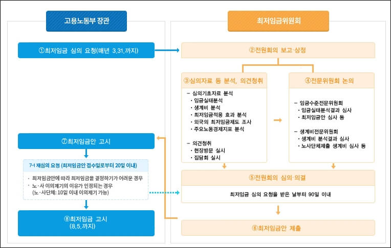 1. 최저임금 시행령 제7조에 의거하여 고용노동부 장관은 매년 3월 31일까지 최저임금위원회에 다음 연도 최저임금 심의를 요청