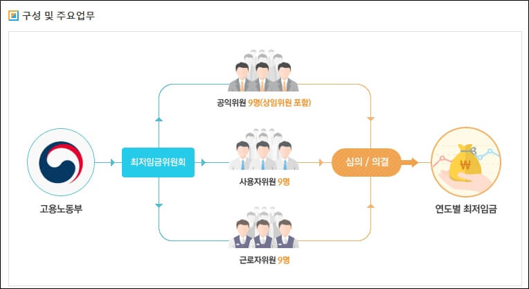 대한민국의 최저임금은 최저임금법 제12조에 의거하여 고용노동부 산하기관인 최저임금위원회에서 결정합니다. 최저임금위원회의 구성단을 살펴보면