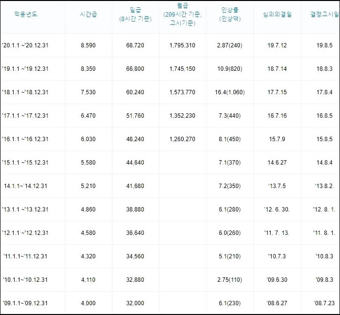 최저임금위원회에서 제공하는 지난 10년 간에 최저임금 표입니다. 2009년 4,000원으로 시작한 최저임금은 2020년 현재 8,590원까지 올라갔습니다. 인상률을 보면 2.87% ~ 16.4%까지 다양한데요.. 그만큼 경제상황에 비례하여 결정하는 사안이기 때문에 매년 인상률을 놓고 큰 싸움이 벌어지곤 합니다. 최근 10년 동안의 인상률을 평균으로 하면 약 8.5%가 되겠네요.