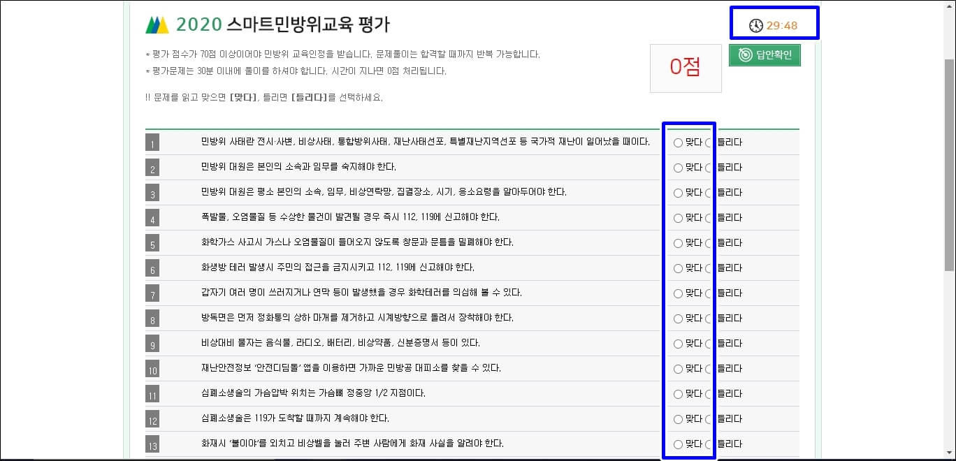 문항은 총 20문항이며 시간 30분을 줍니다. 일단 정답을 보기 전에 20 문항을 한 번씩 살펴봤는데 틀 리다를 체크할 문항이 없어서 전부 다 맞다를 체크했습니다. 문제 자체는 누구나 풀 수 있을 정도로 쉬운 난이도이며 기본적인 상식만 있어도 남녀노소 문제를 풀 수 있을 정도로 난이도가 쉬운 문제였습니다.