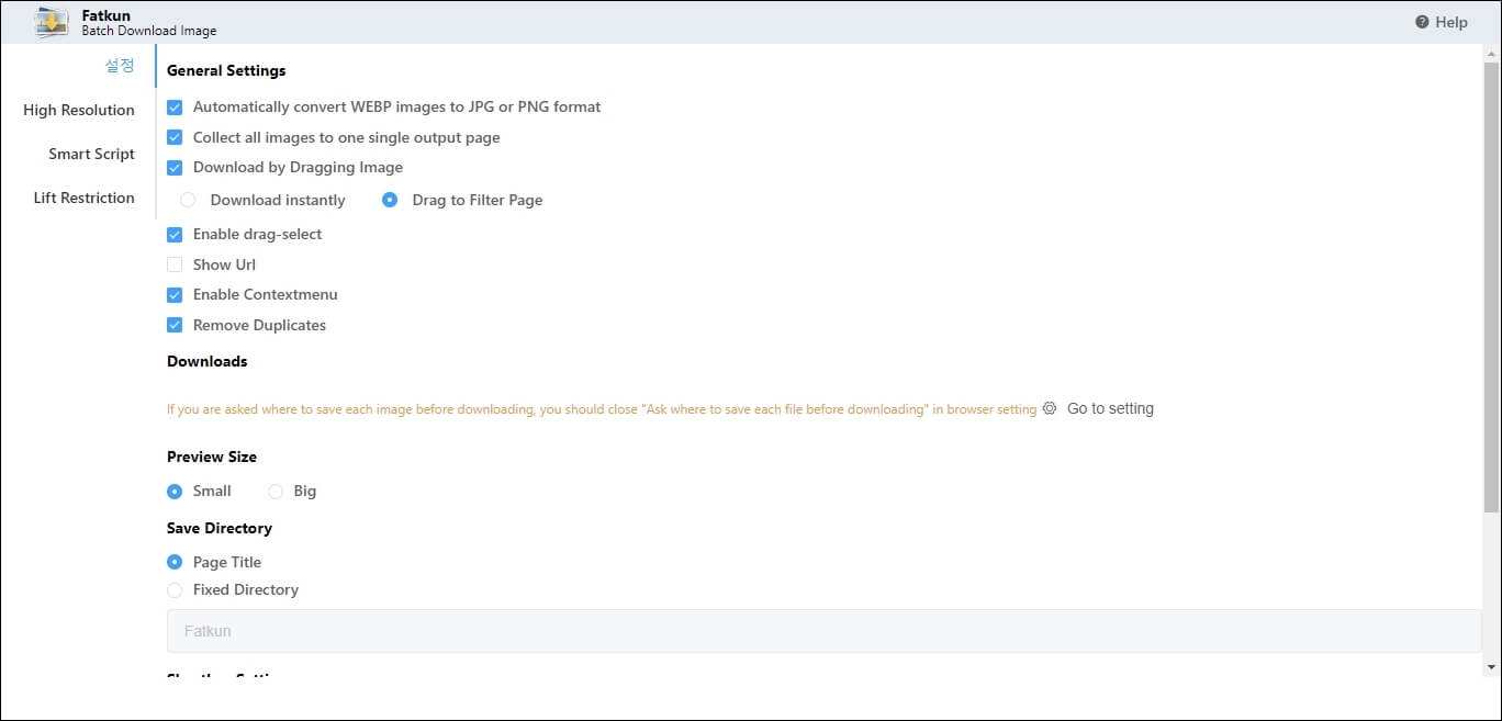 Fatkun을 클릭하시고 톱니바퀴 설정을 누르시면 몇 가지 옵션을 지정할 수 있는데요.. 쓸 일은 없지만 그래도 몇 가지만 알아보도록 하겠습니다.