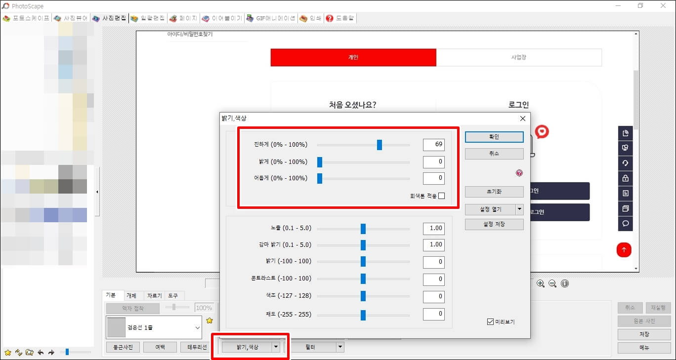 포토스케이프를 여시고 수정할 이미지를 업로드하신 후에 밝기, 색상을 클릭하셔서 진하게, 밝게, 어둡게 3가지 중 하나를 사용하여 이미지의 밝기를 조절해 줍니다.