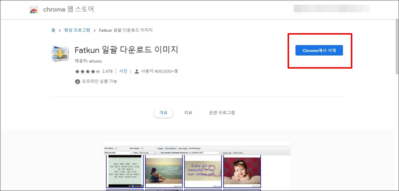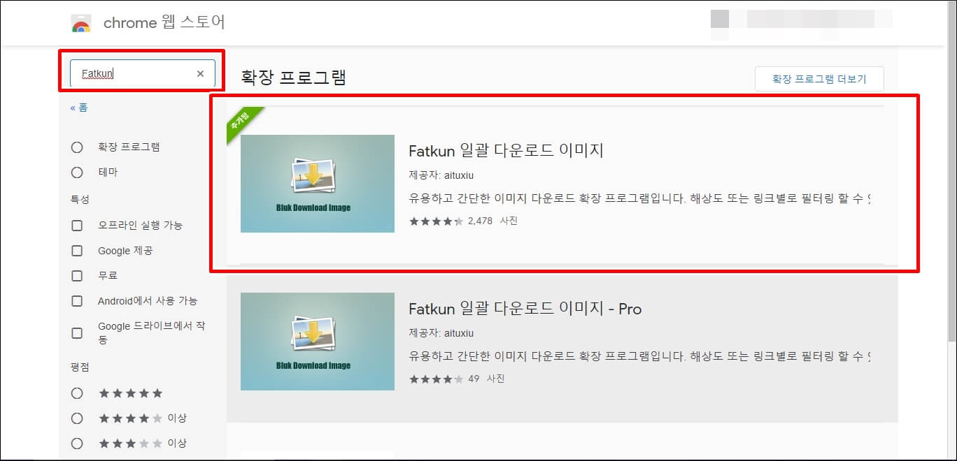 확장 프로그램 검색창에 Fatkun을 검색하시고 Fatkun 일괄 다운로드 이미지를 클릭합니다.