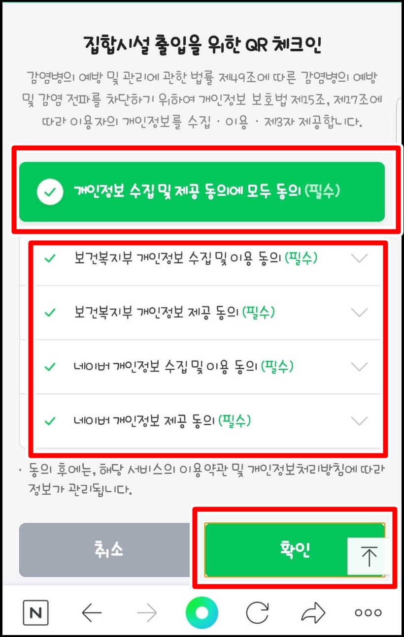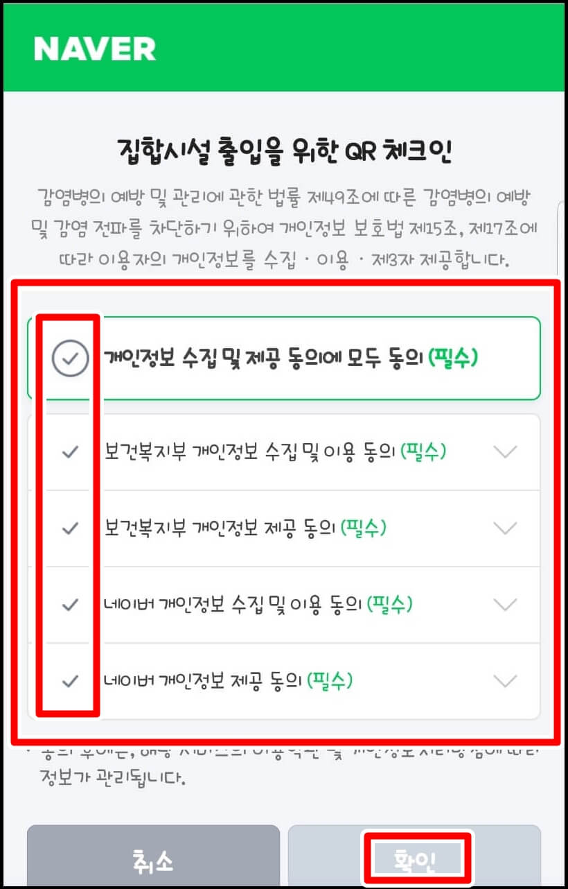 네이버에서 qr코드를 방법 받는 방법은 다음카카오에서 발급받는 방법과 동일합니다. 우선 네이버 앱을 설치하고 접속하신 다음 상단에 [QR 체크인]을 눌러봅니다. 그럼 집합시설 출입을 위한 체크인 창이 뜨는데 개인정보 수집에 모두 동의하 신다음 확인을 클릭합니다.