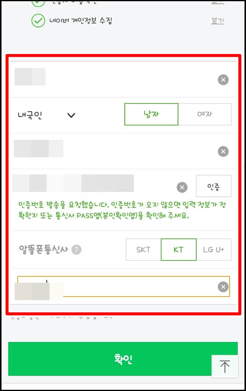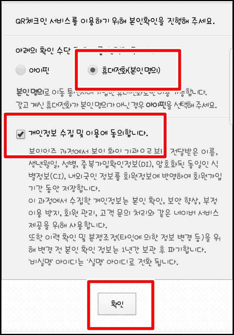 보건복지부와 네이버 개인정보 제공 동의에 체크하신 다음에 본인 확인을 거치시고 확인을 누릅니다.