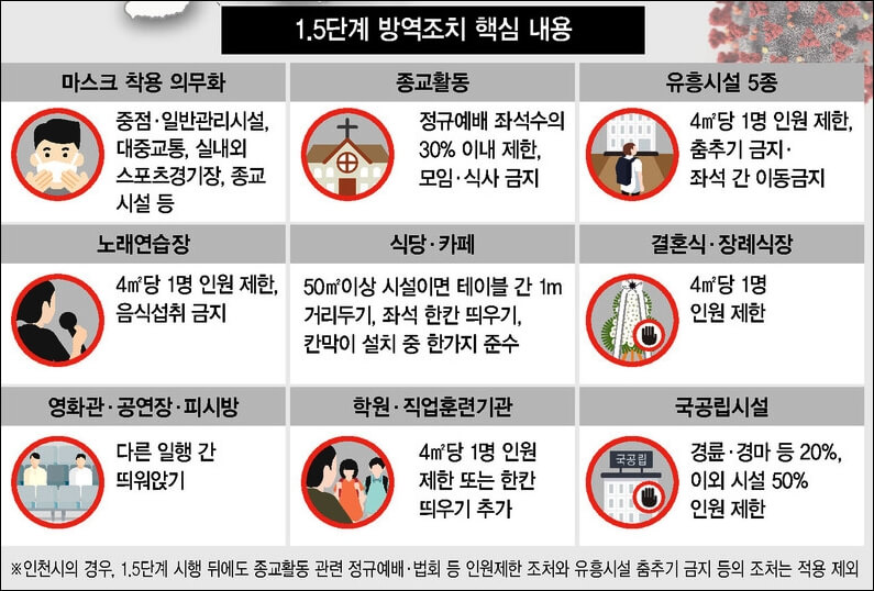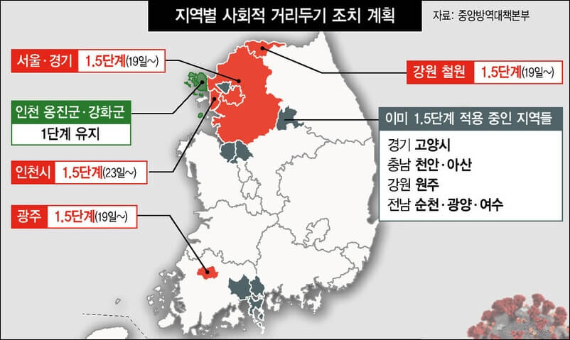 중앙 방역대책본부에서 제공하는 자료를 살펴보면 2020년 11월 19일부터 서울 경기, 인천시, 광주, 철원 등에서 사회적 거리 두기 1.5단계를 적용한다고 합니다. 이렇게 되면 어떤 부분에서 제한이 되는지 살펴보도록 하겠습니다.