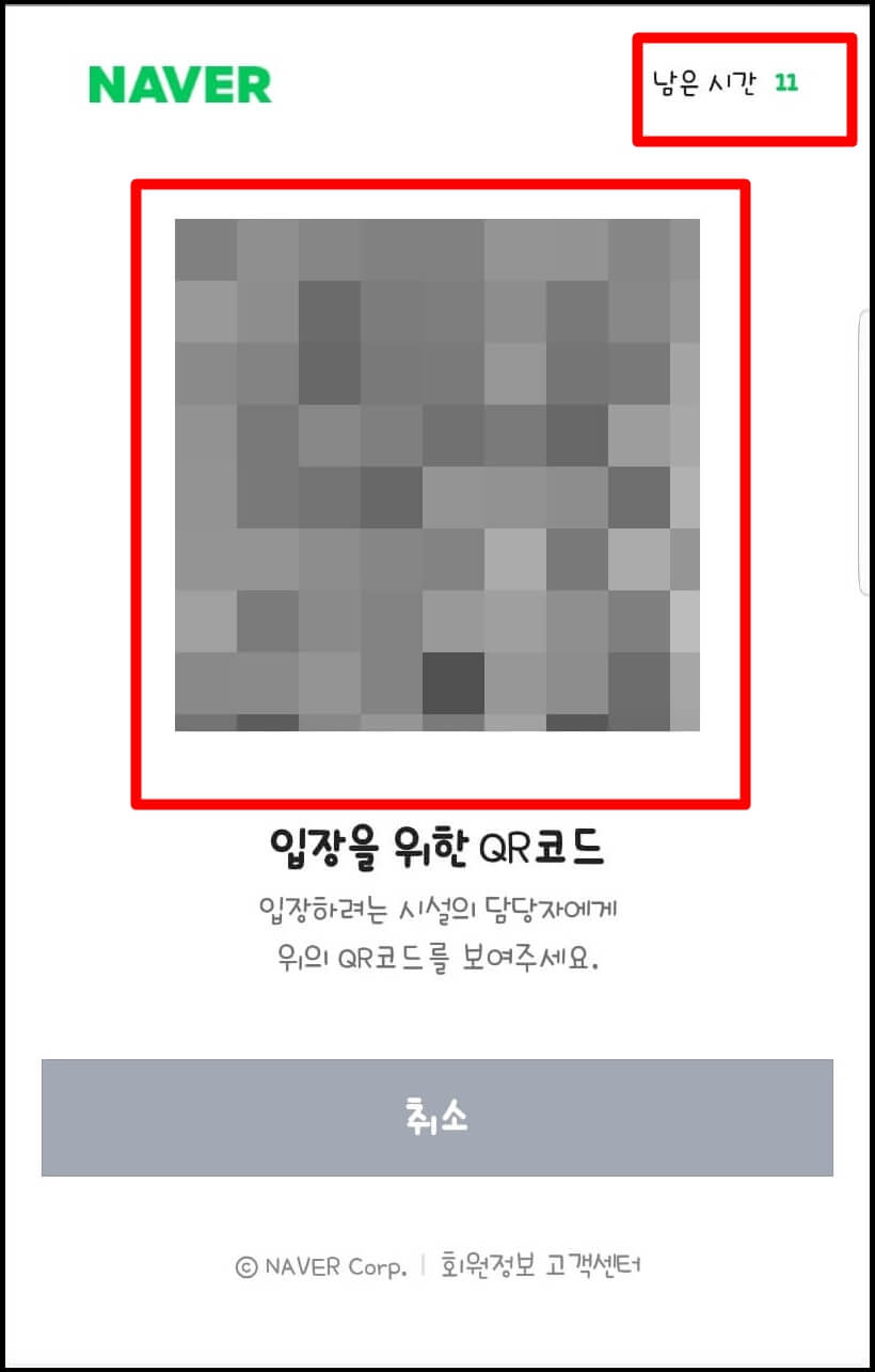 이름과 통신사, 전화번호 성별 등 필요한 개인정보를 입력하시고 본인 인증을 거치신 후에 확인을 누르시면 아래와 같이 QR코드가 뜨는데요... 네이버 qr코드도 다음카카오와 마찬가지고 발급 후 15초 간만 유효하며 15초가 지나면 다시 생성하셔야 합니다.