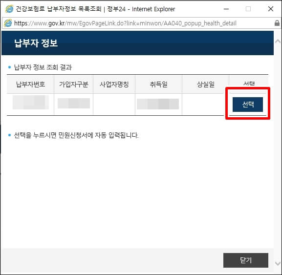 수령방법에는 온라인 발급(본인 출력), 온라인 발급(전자문서 지갑), 온라인 발급(제삼자 제출)으로 나뉩니다. 여기서 원하는 방법을 선택하시고 민원 신청하기를 누르면 납부자 정보가 자동으로 조회가 되는데요.. 우측에 보시는 것처럼 선택을 클릭하시면 됩니다.