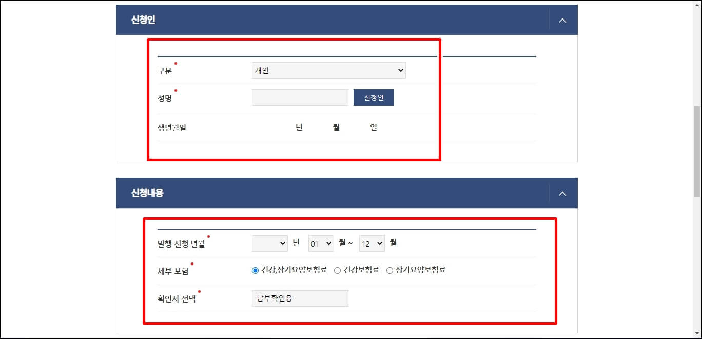 구분 성명 등을 입력하시고 발행 신청 년월, 세부 보험, 확인서 선택을 합니다. 세부 보험과 확인서 선택은 정확하게 선택을 하셔야 됩니다.